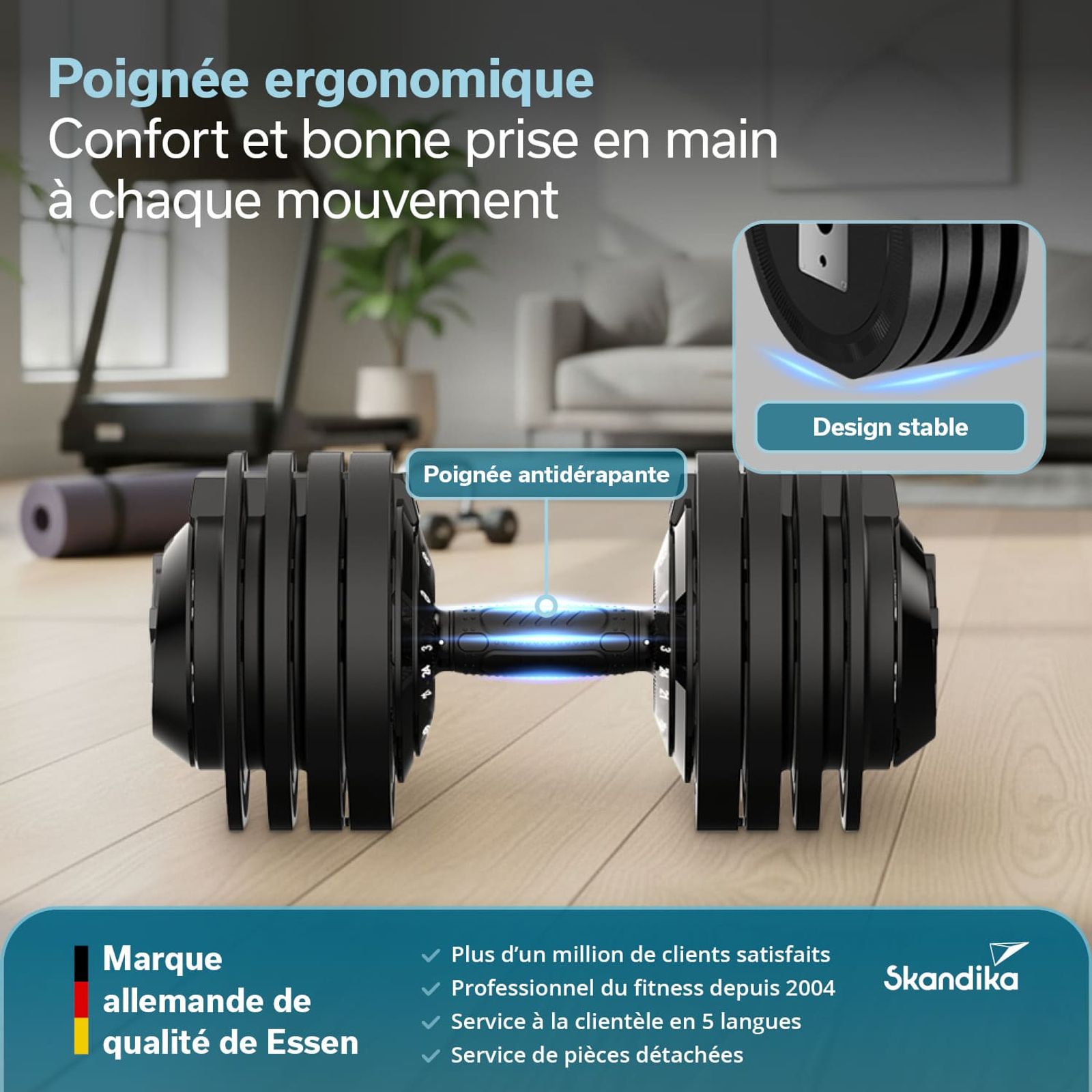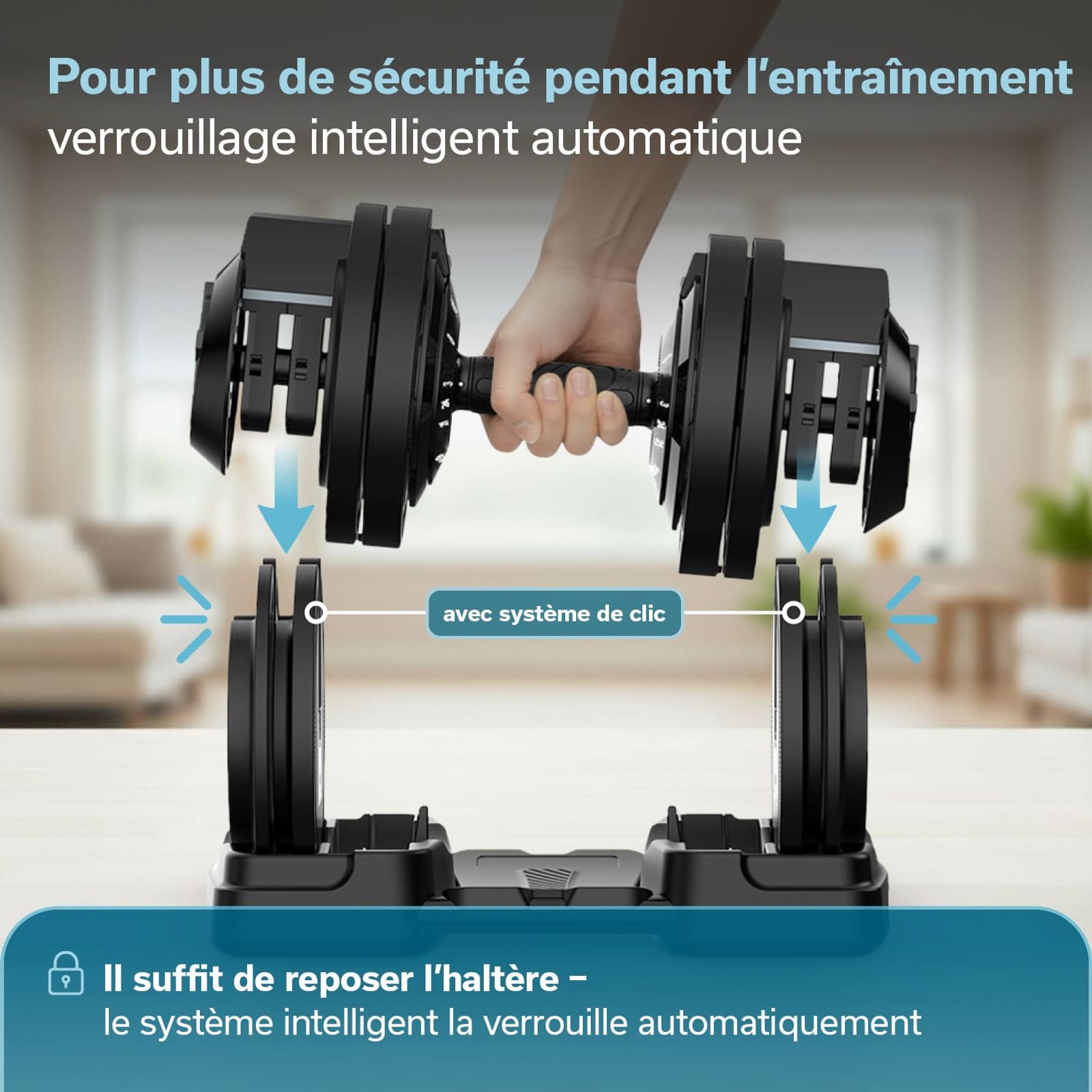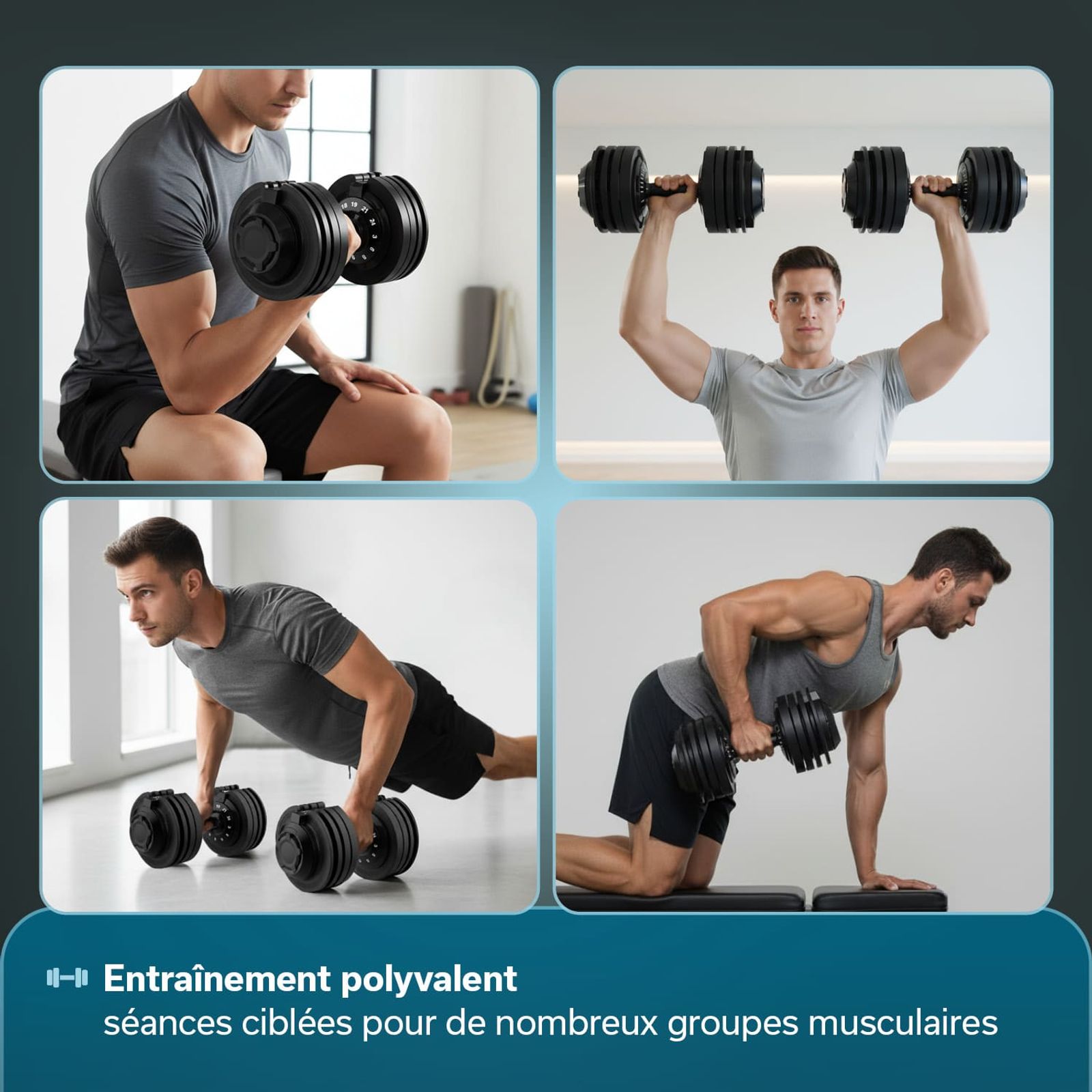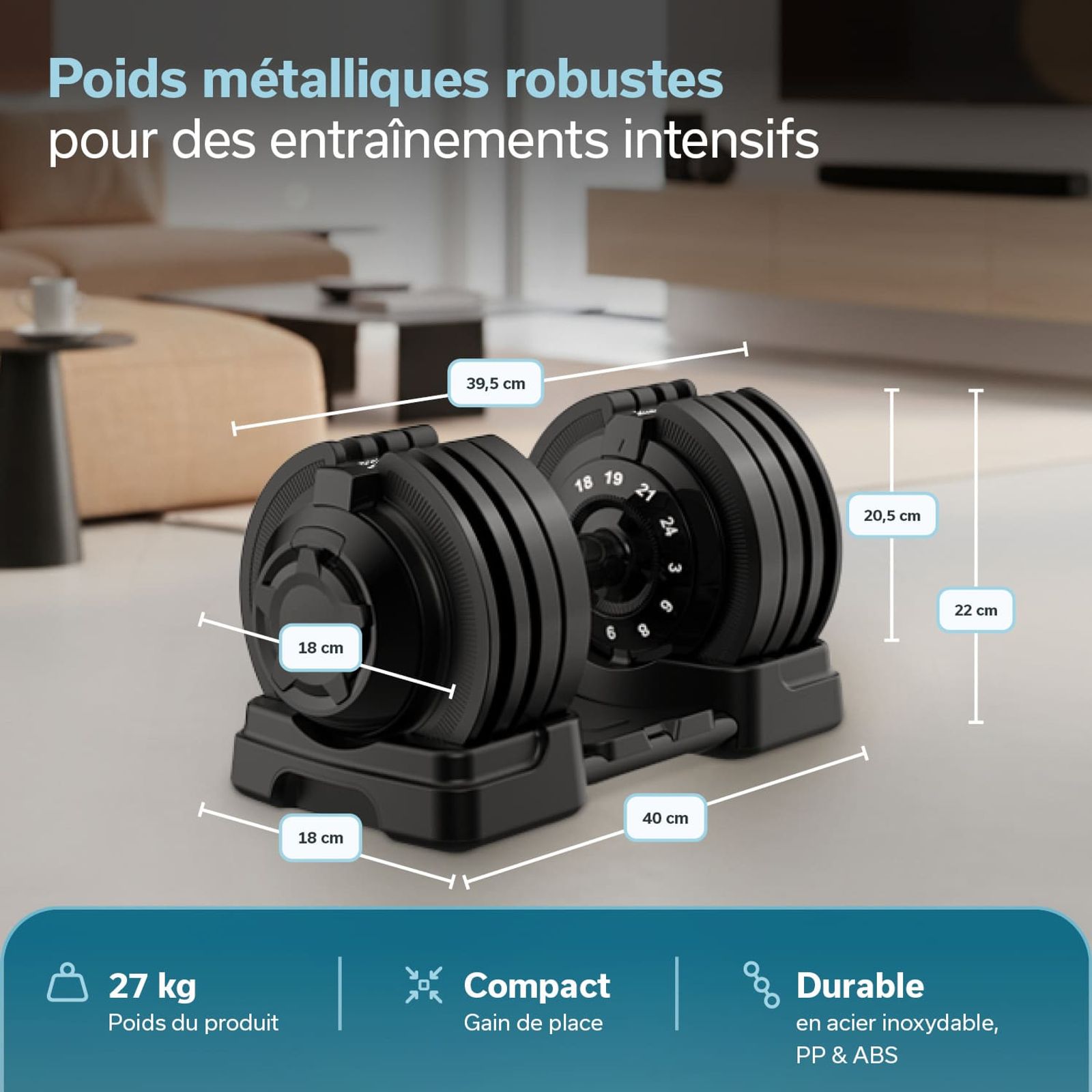 • Haltère réglable avec 12 niveaux de poids de 3 kg à 24 kg pour un entraînement musculaire progressif