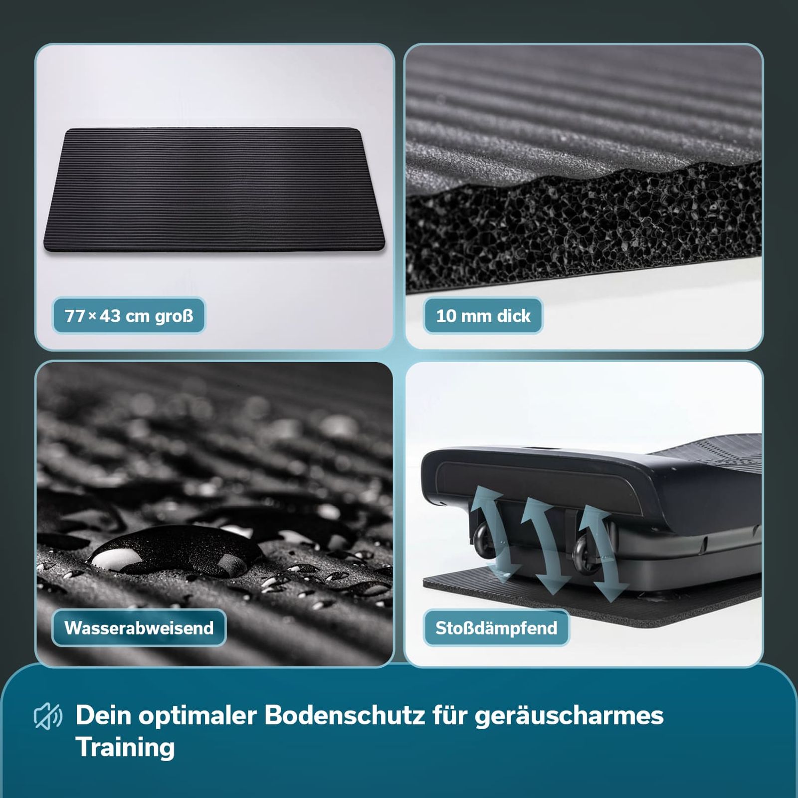 - Dimensions : 790 × 470 × 200 mm / Tapis de protection : 77 × 43 × 1 cm / Poids : 19 kg / Poids max. de l'utilisateur : 150 kg