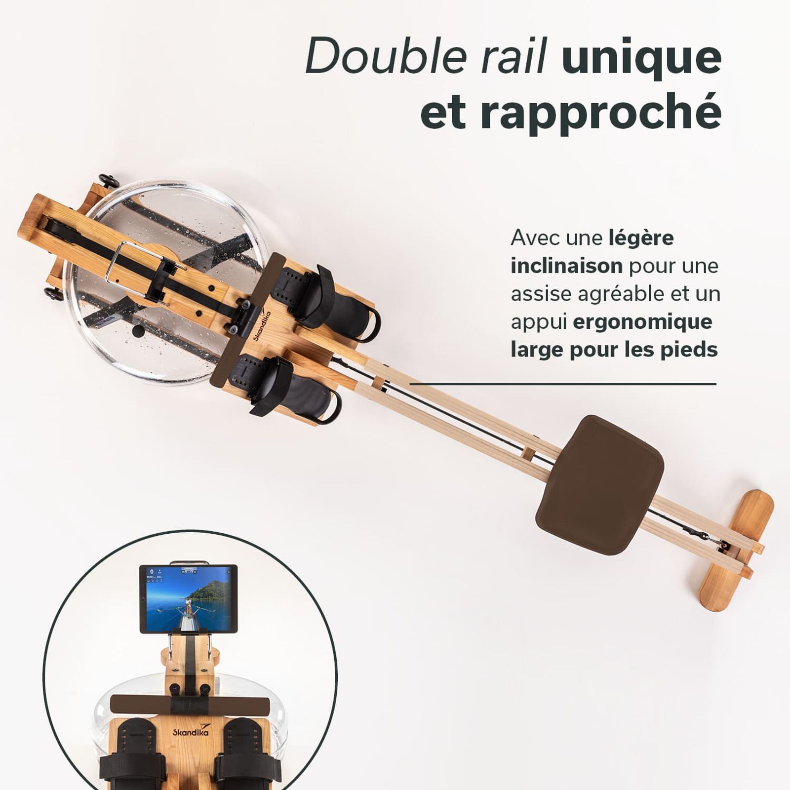 Le double rail entièrement nouveau, qui se joint, permet aux pieds d'avoir la largeur du bassin. Résultat : des mouvements ergonomiques corrects pour effectuer des séances longues et intensives sans ressentir de douleurs. Assortis à cela : un siège ergonomique rembourré et une poignée de rame adaptée à la paume des mains avec revêtement antidérapant.