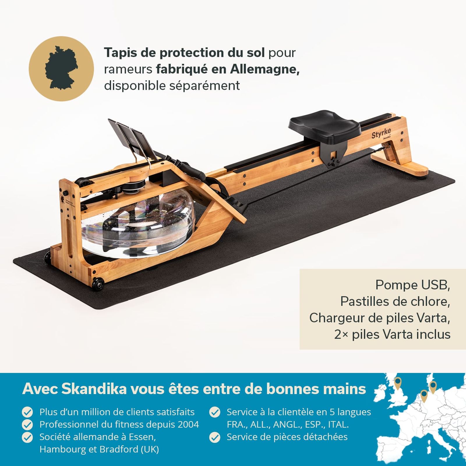 Styrke Premium kommt mit einer elektrischen USB-Pumpe und dem dazugehörigen Bluetooth-Empfänger. Zwei AAA-Varta-Akkus (inkl. Varta-Schnellladegerät) für den Bluetooth-Sender sorgen dafür, dass Styrke nach kurzem Aufbau sofort einsatzbereit ist. Eine ausführliche Anleitung ist ebenfalls im Lieferumfang enthalten.