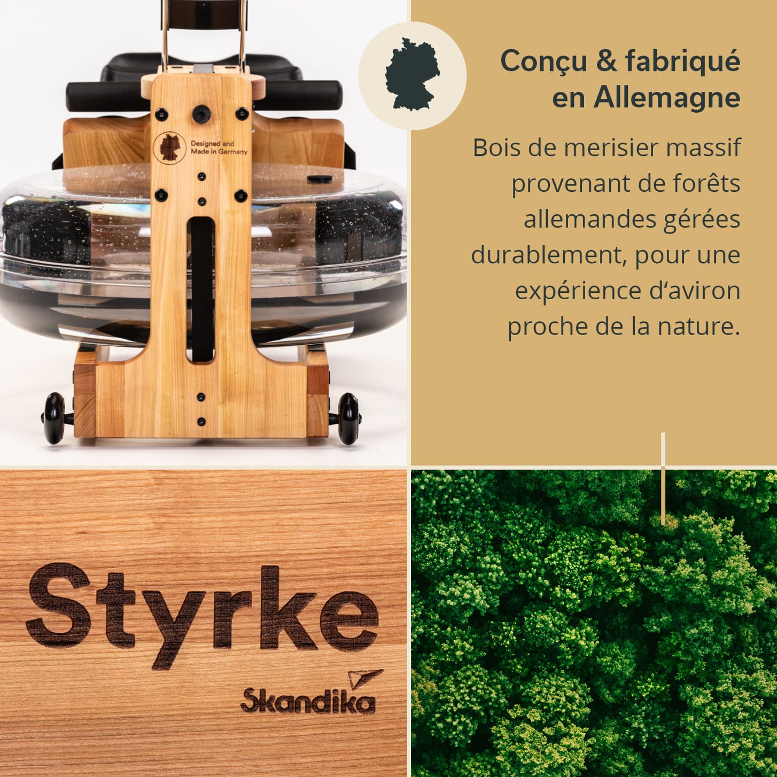 Die neueste Generation unseres Premium-Rudergeräts Styrke aus massivem Kirschholz vereint nun nicht nur stilvolles Design mit professionellen Ansprüchen an Ergonomie, Ästhetik und Performance, sondern hebt mit seinem Titel „Made in Germany" Qualität und Standards auf ein noch höheres Level. Zusätzlich rückt durch nachhaltig bewirtschaftete Wälder und verschnittarme, lokale Verarbeitung das Bewusstsein für unsere Umwelt in den Vordergrund. Das Ergebnis: ein maximal authentisches Rudererlebnis in Symbiose mit deutscher Handarbeit und einer Liebe für unseren Planeten.