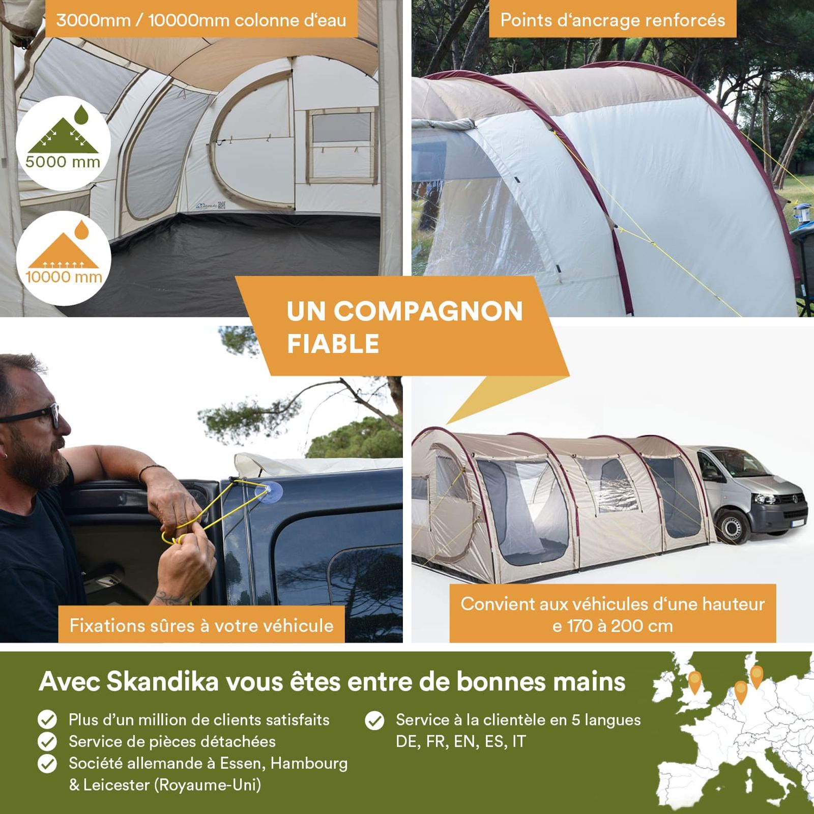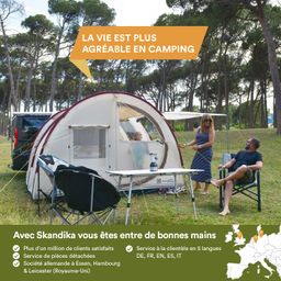Le Skandika Esbjerg Travel 4 Protect est le compagnon idéal pour tous ceux qui apprécient l'espace et le confort supplémentaires lors de leurs déplacements. Avec une dimension totale de 480 x 320 cm et deux cabines de couchage pouvant être accrochées séparément, l'auvent de bus peut accueillir jusqu'à 4 personnes - parfait pour les voyages itinérants et les excursions en camping dans un monospace ou un fourgon avec porte latérale coulissante.