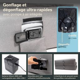 - Gonflé en 2 minutes seulement grâce à une pompe électrique puissante et rechargeable