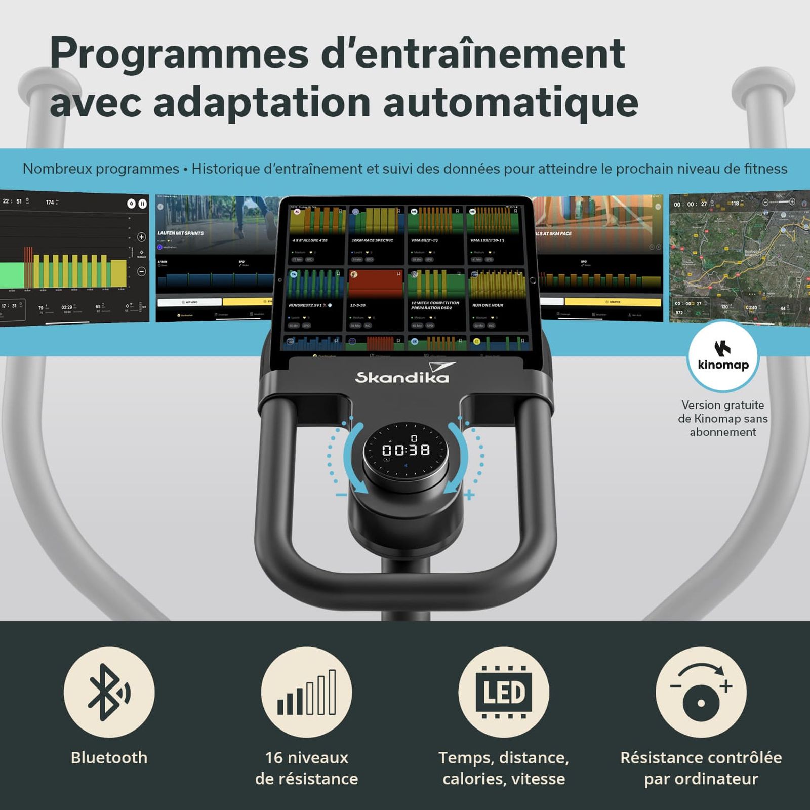 L'interface Bluetooth permet de se connecter à des applications telles que Kinomap. Grâce au partenariat Gold avec Kinomap, les clients de Skandika reçoivent un code leur permettant de tester gratuitement la version complète de l'application Kinomap pendant 60 jours. Des vidéos en direct, des coachings et des vidéos d'entraînement virtuelles amènent chaque séance d'entraînement à un tout autre niveau et permettent des entraînements dans les plus beaux endroits du monde.