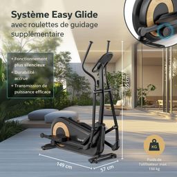 Grâce aux roulettes de transport intégrées à l'avant et à une poignée pratique à l'arrière, l'appareil peut être déplacé sans effort vers différents endroits. Avec une capacité de charge maximale de 150 kg, le vélo elliptique offre des performances fiables et une grande stabilité, même pendant les séances d'entraînement intensives.
