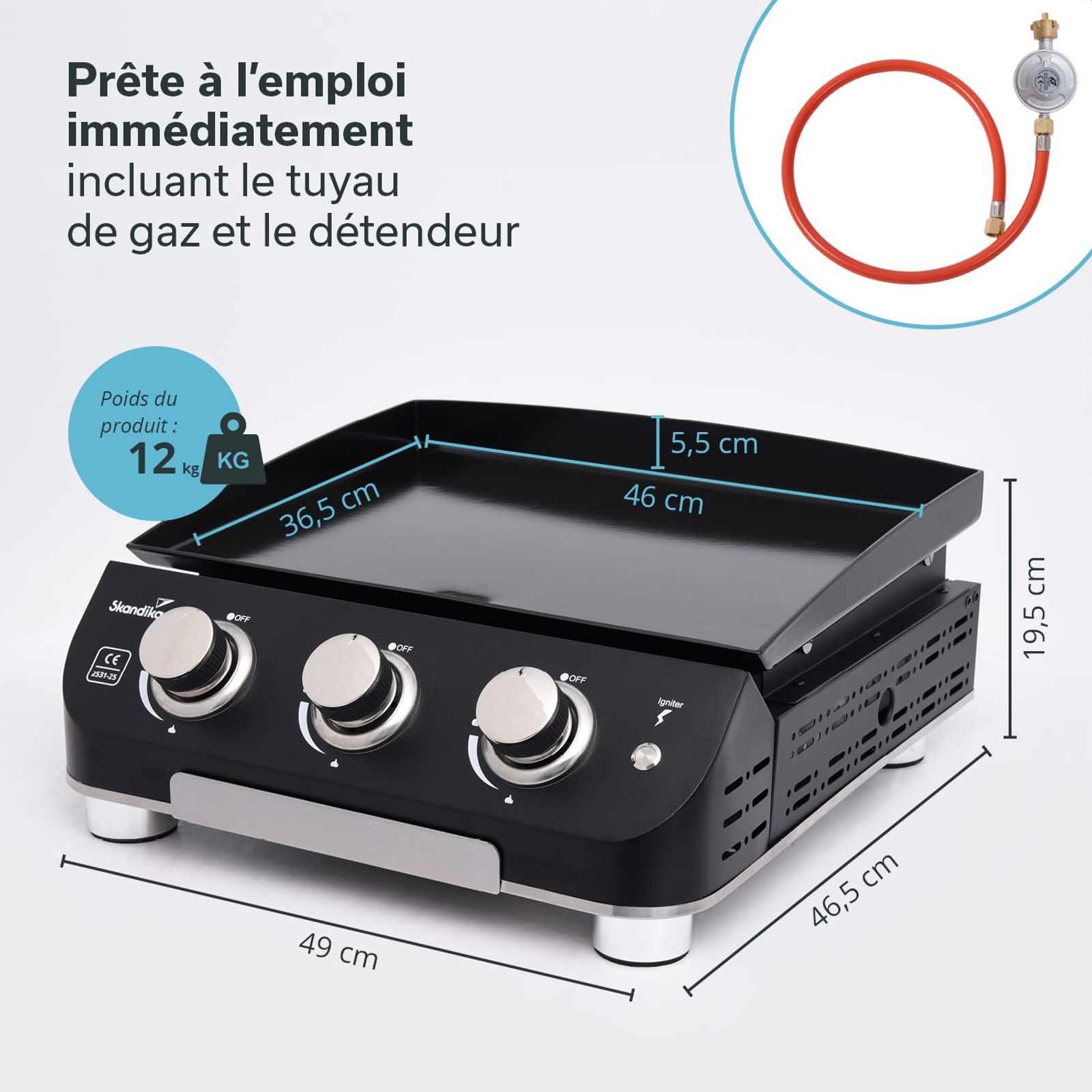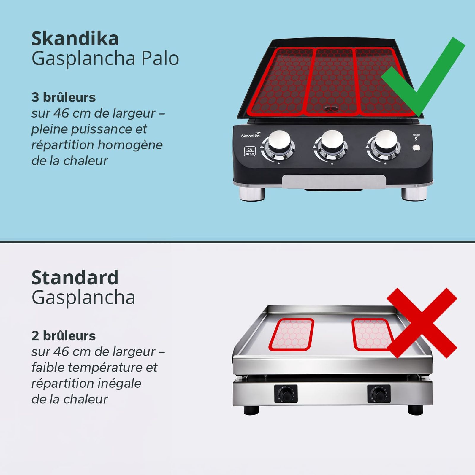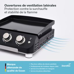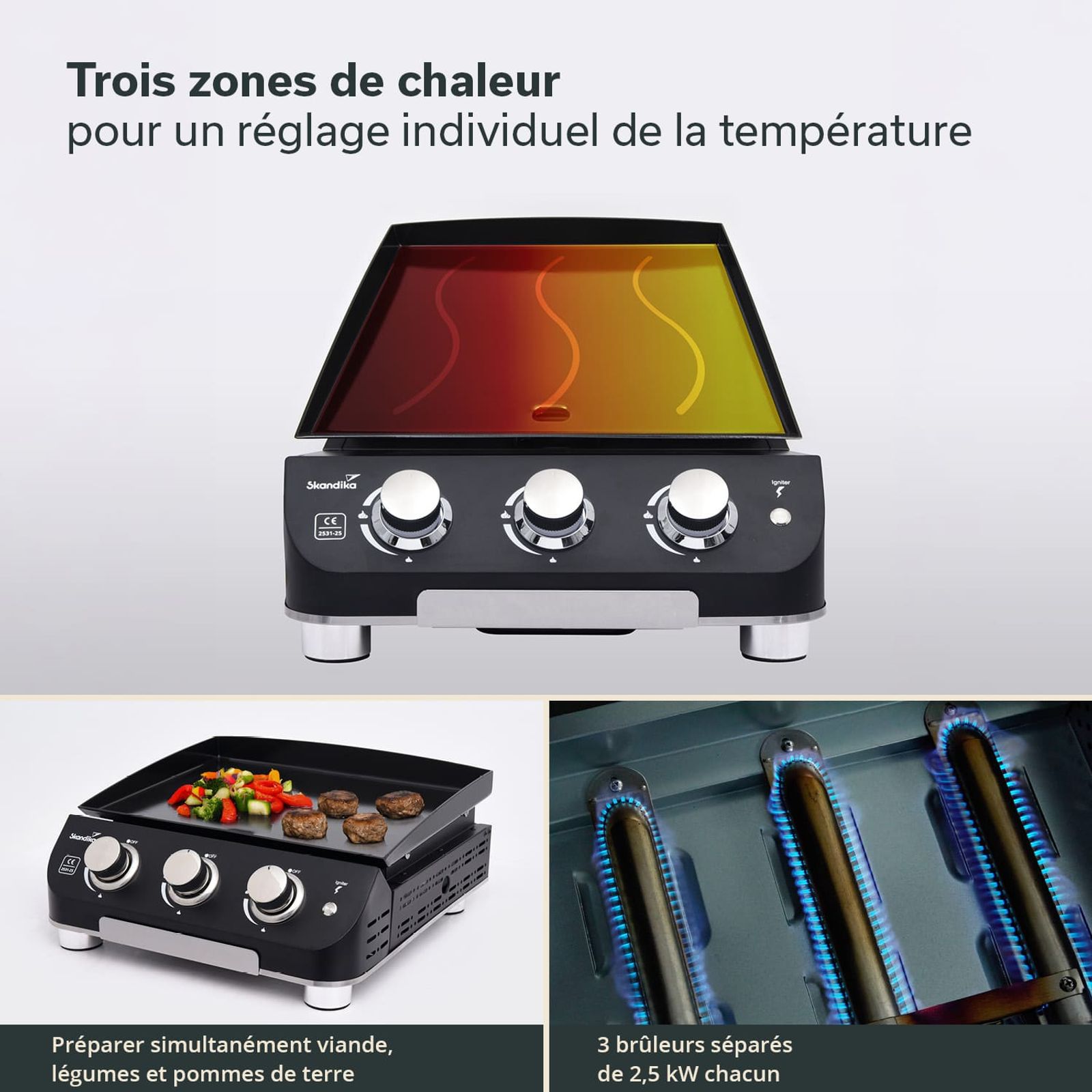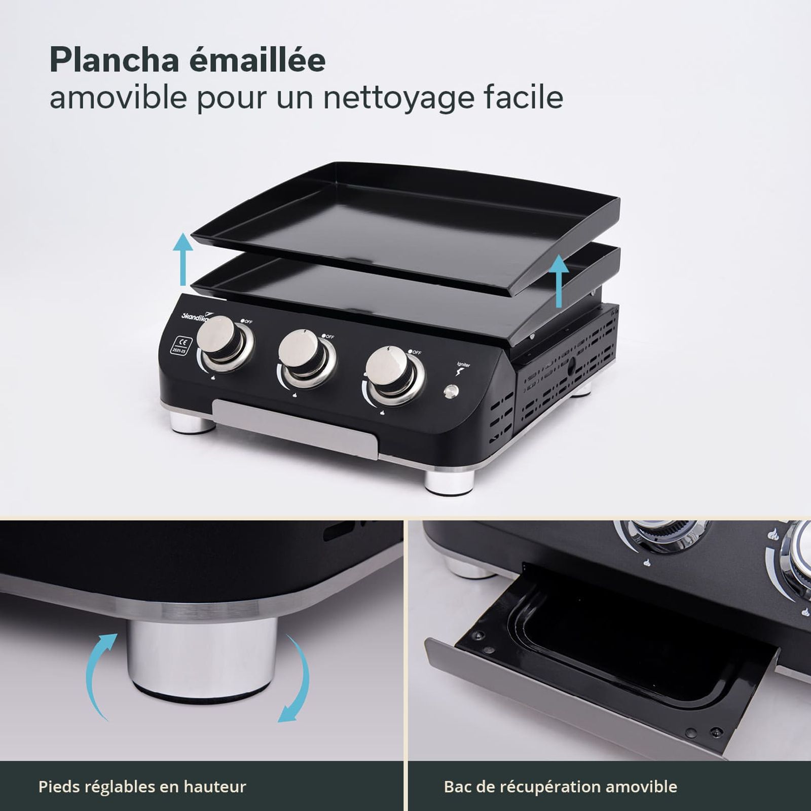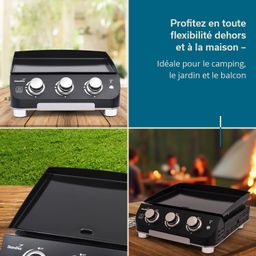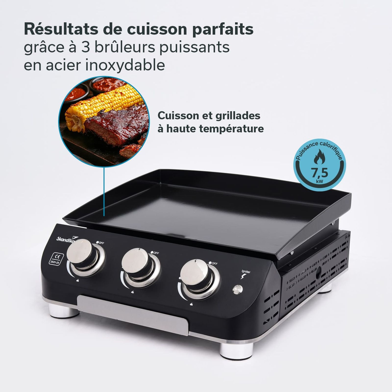 - Plancha à gaz à 3 brûleurs pour une répartition uniforme de la chaleur sur toute la plaque de cuisson.