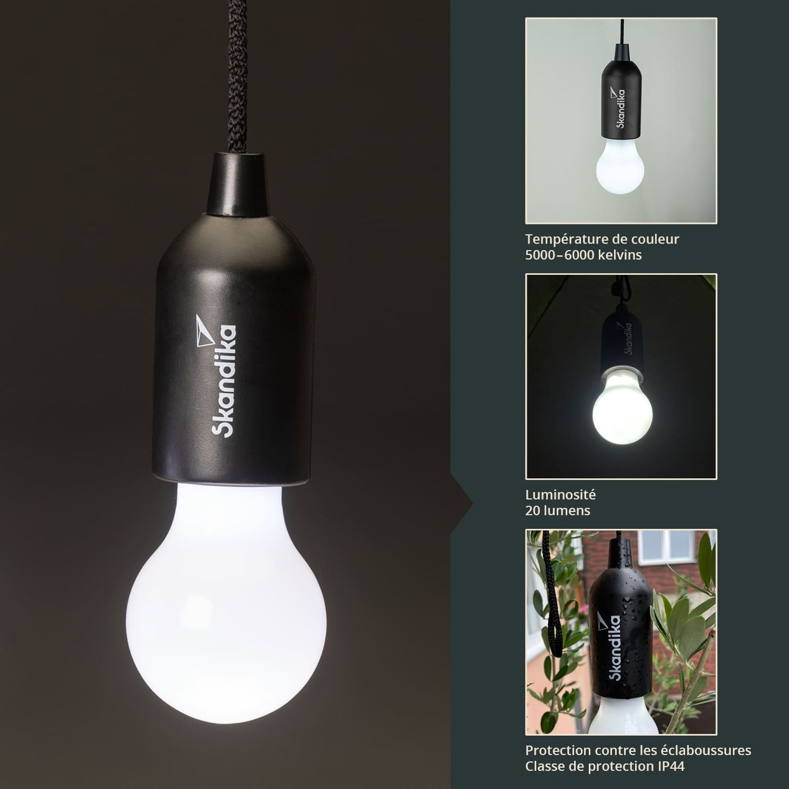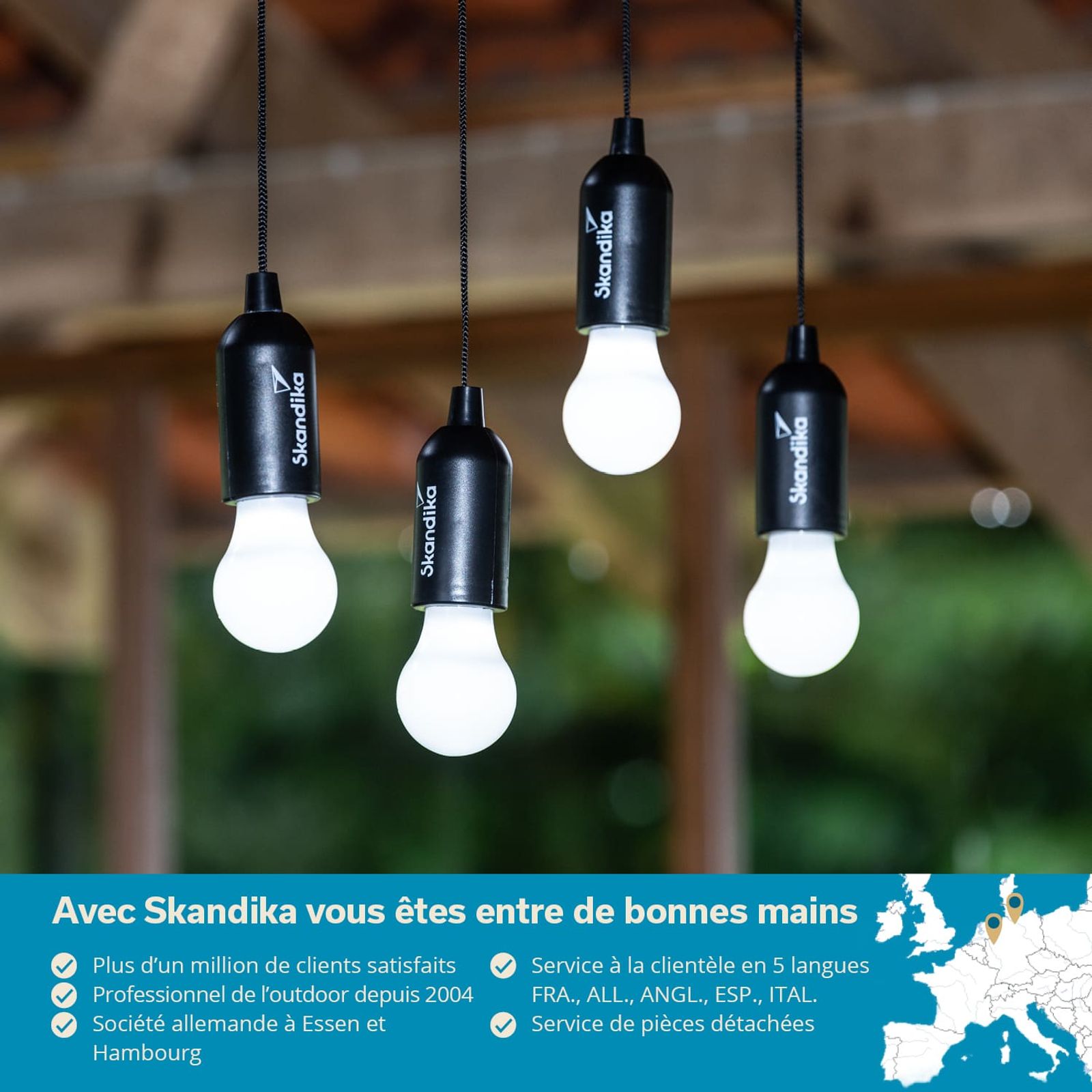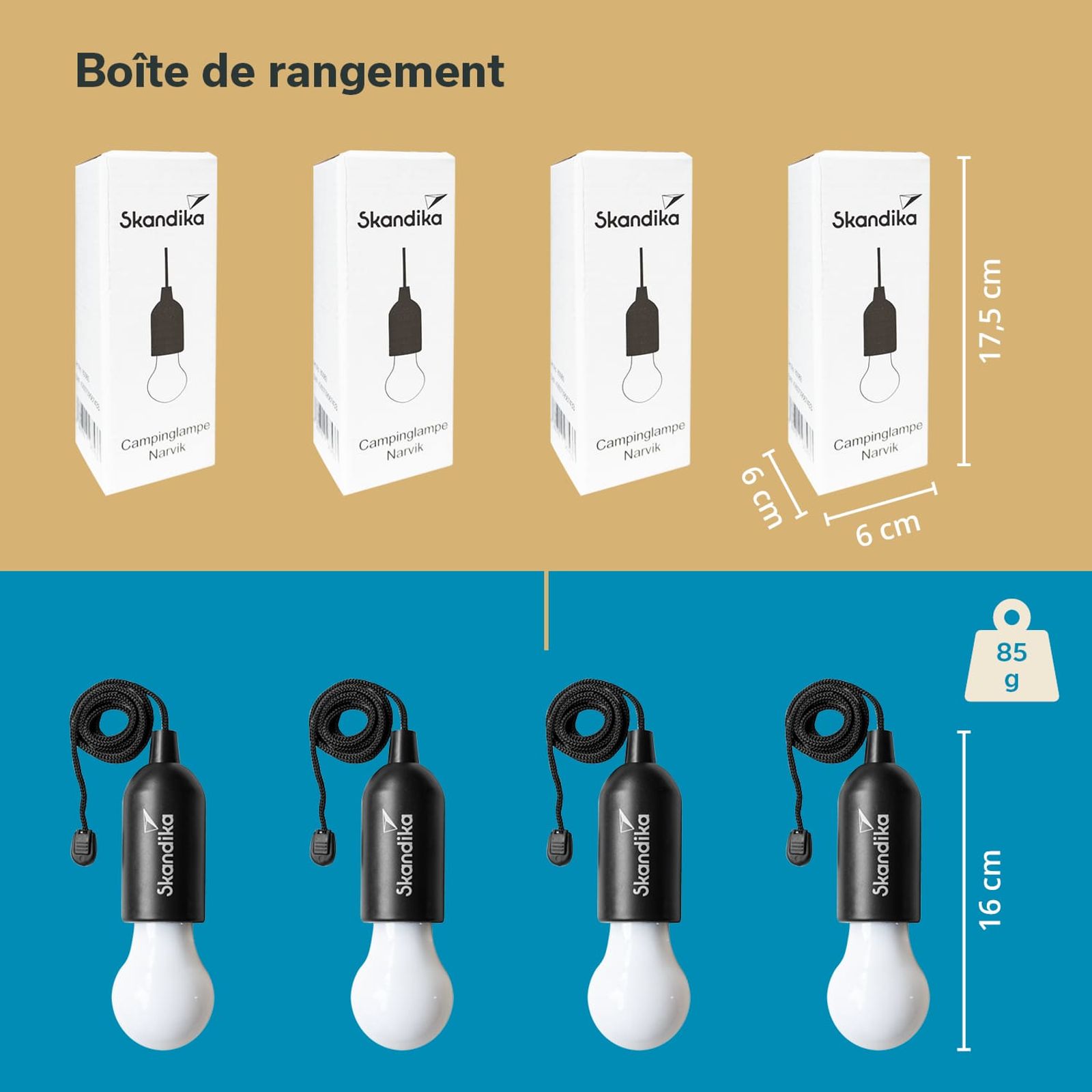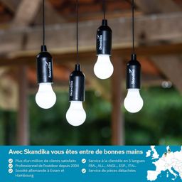 La ville norvégienne de Narvik, qui a donné son nom à notre astucieuse petite lampe de camping, se trouve bien au-dessus du cercle polaire arctique et est privée de soleil pendant des mois en hiver. Il suffit de tirer brièvement sur le cordon pour que la Skandika Narvik produise immédiatement une lumière vive et dissipe ainsi en un clin d'œil l'obscurité la plus profonde.