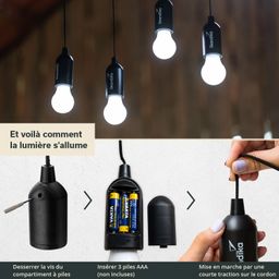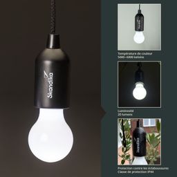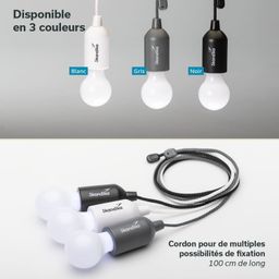 La petite lampe LED pratique au look d'ampoule est simplement alimentée par trois piles AAA et est complètement indépendante d'une source de courant fixe. La lampe est suspendue à l'aide d'un cordon de 100 cm de long à l'extrémité supérieure, qui peut être fixé de différentes manières. Nouée directement à une corde, attachée en boucle et suspendue à un crochet ou simplement enroulée plusieurs fois autour d'une branche - la longue corde permet d'utiliser facilement cette petite merveille lumineuse partout et à tout moment.