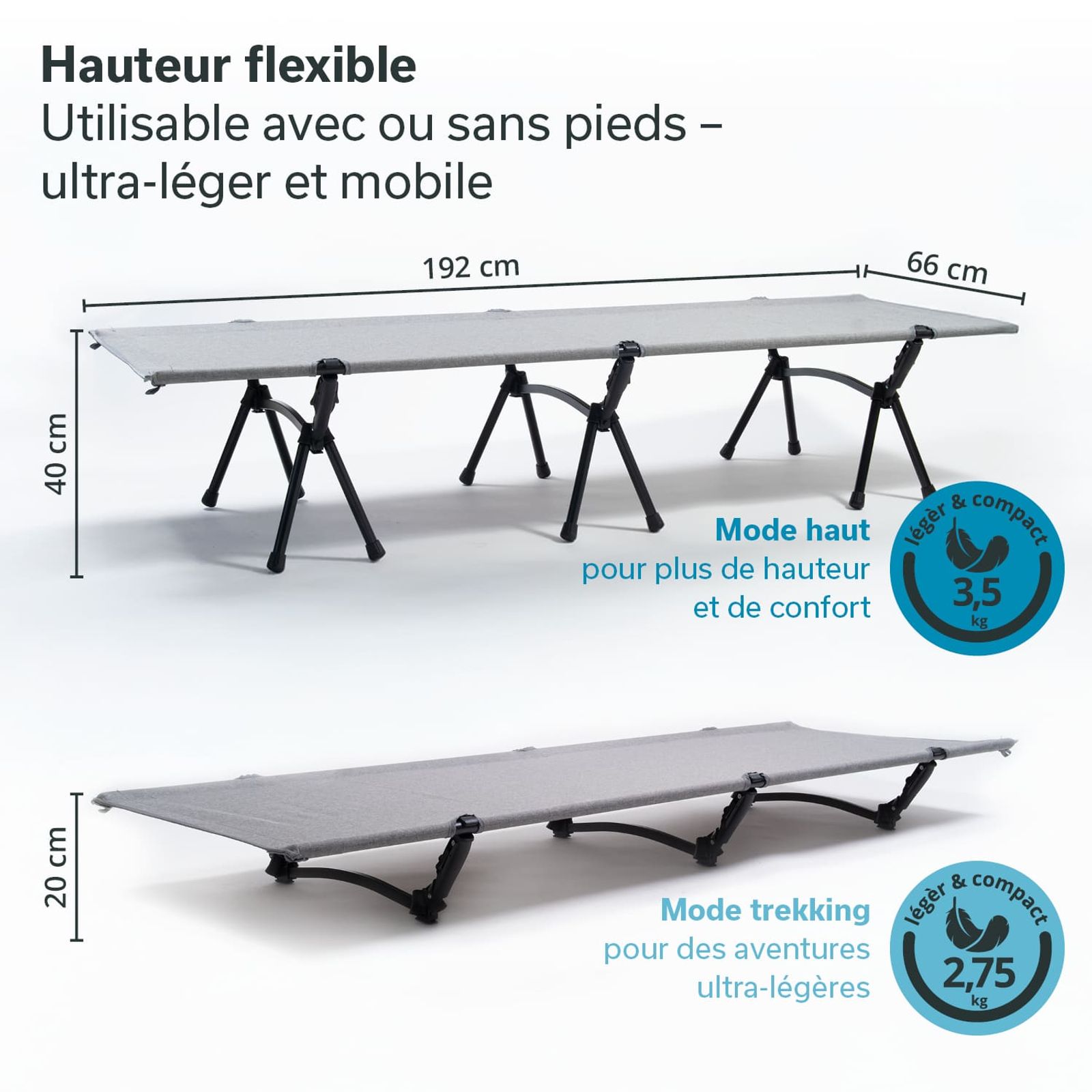 Les pieds peuvent être retirés en un tour de main pour réduire la hauteur du lit à 20 cm. Ainsi, le lit de camp peut aussi être utilisé dans des tentes avec un plafond bas.