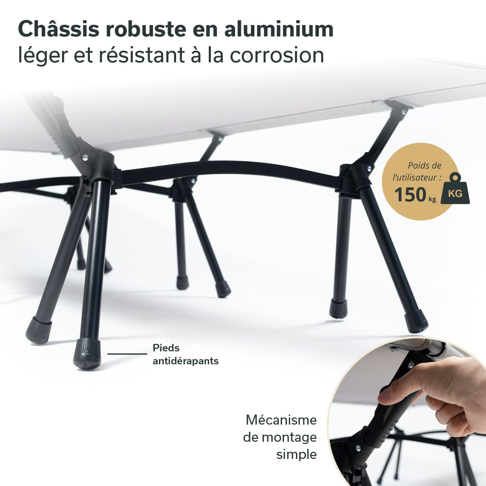 - Châssis robuste en aluminium pouvant supporter un poids de 150 kg