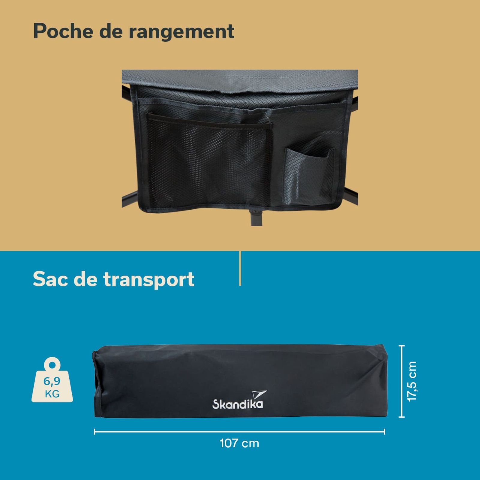 Les points forts de cette chaise longue sont, outre le matériau Oxford agréable et résistant, une hauteur d'assise de 48 cm et un design intelligent qui garantit une répartition équilibrée du poids pendant le sommeil. Grâce à la poche latérale 3 en 1, tous les objets nécessaires, tels que smartphone, tablette, livres ou autres petits objets, sont toujours à portée de main.