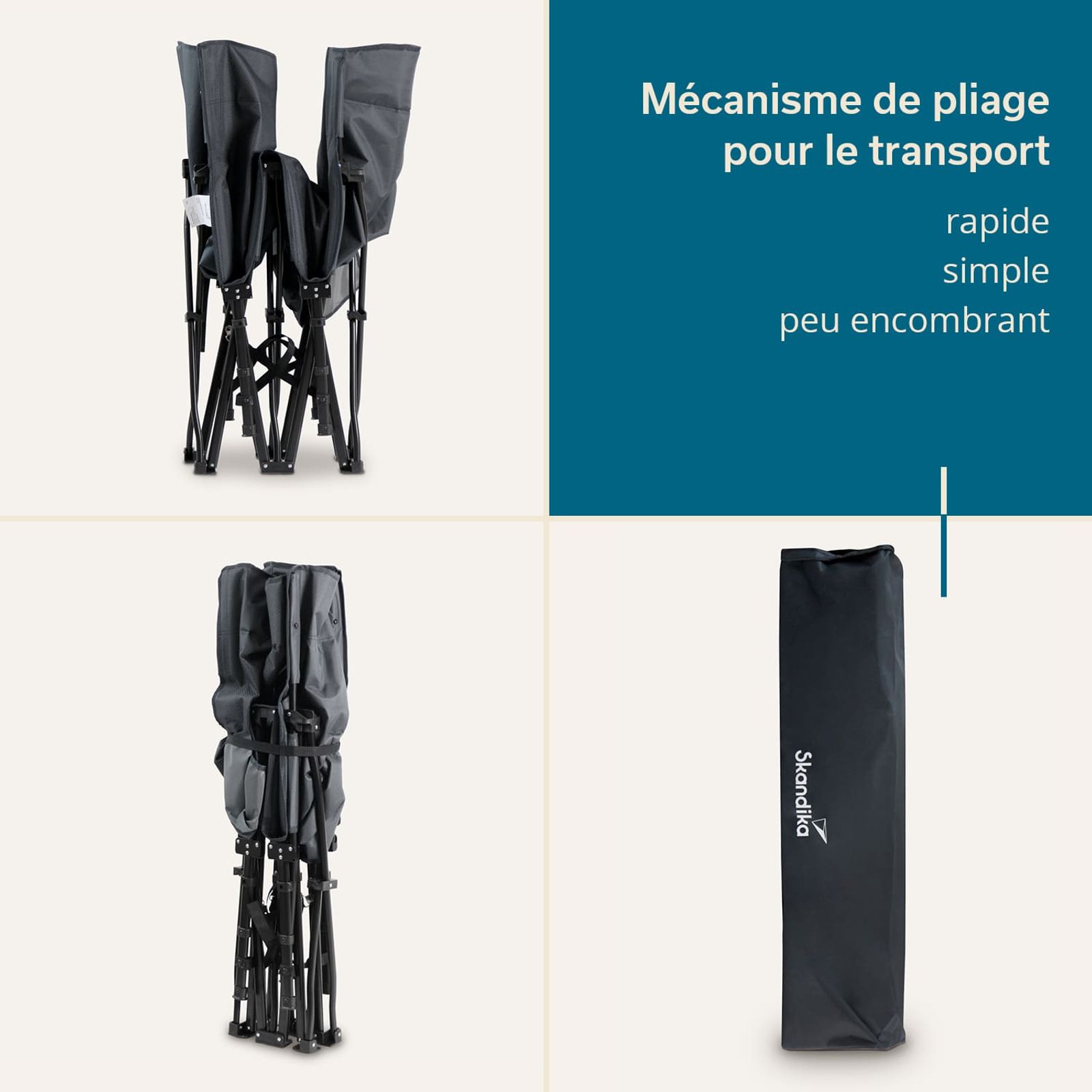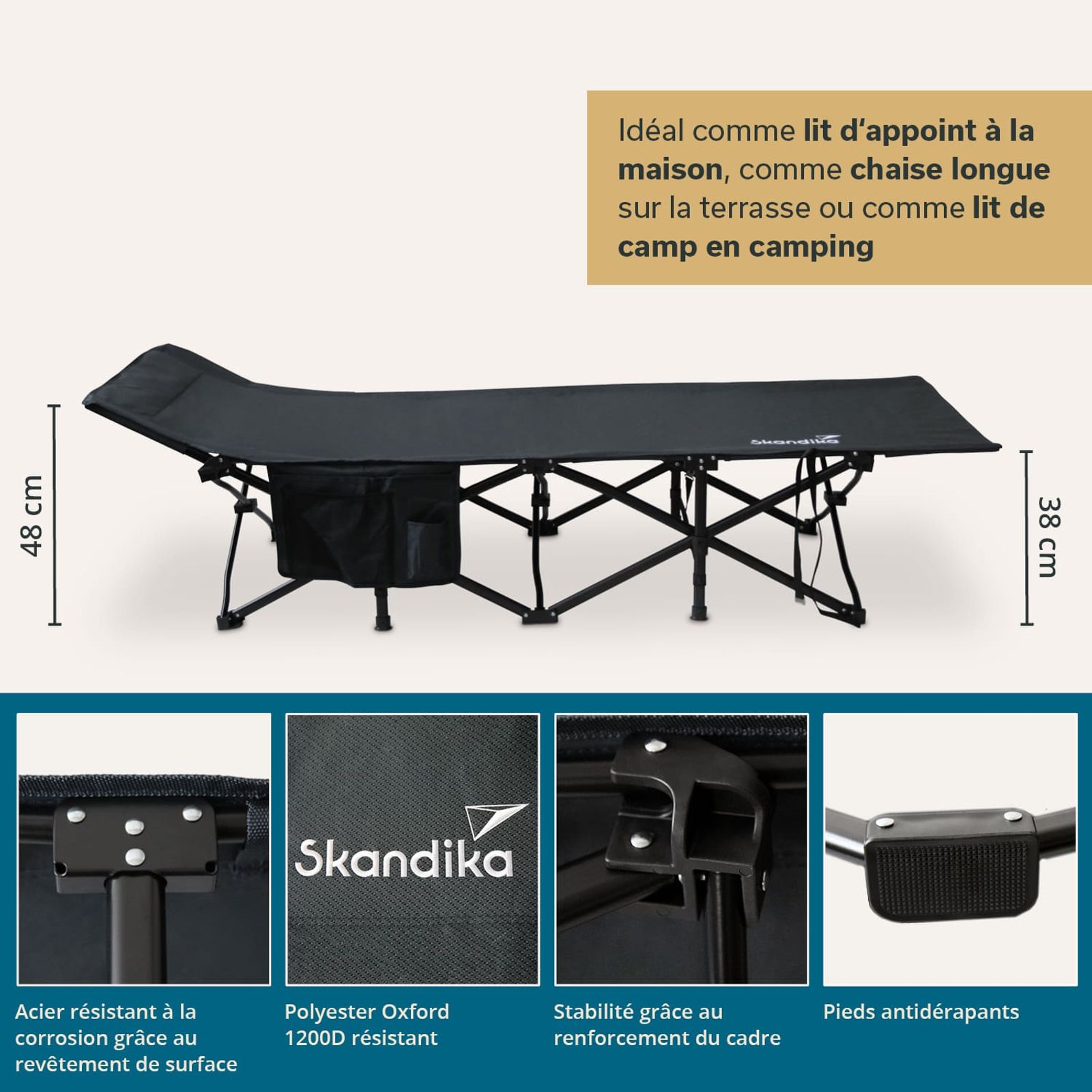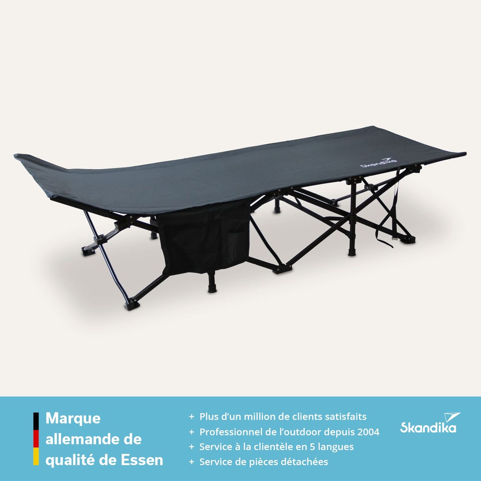 La chaise longue de camping Erola de Skandika offre une place de couchage confortable, elle est très élégante et très facile à utiliser. Elle est la compagne idéale pour toutes sortes d'aventures en plein air.