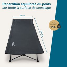 La surface de couchage généreuse garantit une bonne nuit de sommeil et la construction robuste du cadre en acier confère à la chaise longue une capacité de charge allant jusqu'à 150 kg. Grâce à sa fonction de pliage astucieuse, elle est extrêmement rapide et facile à monter : déplier, monter, c'est tout ! Lorsqu'elle n'est plus utilisée, la chaise longue peut être réduite à une petite taille et transportée sans peine grâce à son sac de transport pratique. La chaise longue elle-même ne pèse que 6,9 kg.