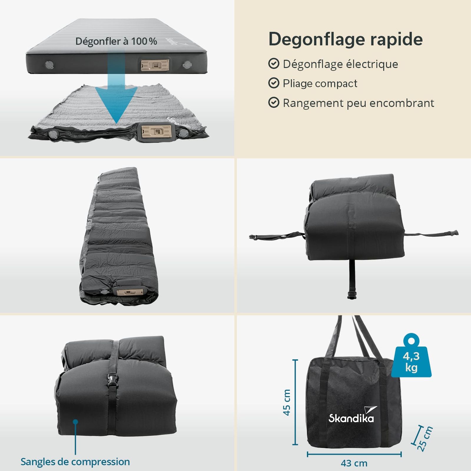 La fonction de dégonflage de la pompe permet d'évacuer complètement l'air. Le matelas devient alors extrêmement plat et se plie sans effort.