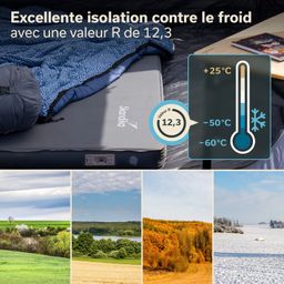 Avec une valeur R de 12,3, le matelas isole efficacement contre le froid du sol et garantit une température agréable même lorsque les températures extérieures sont basses.