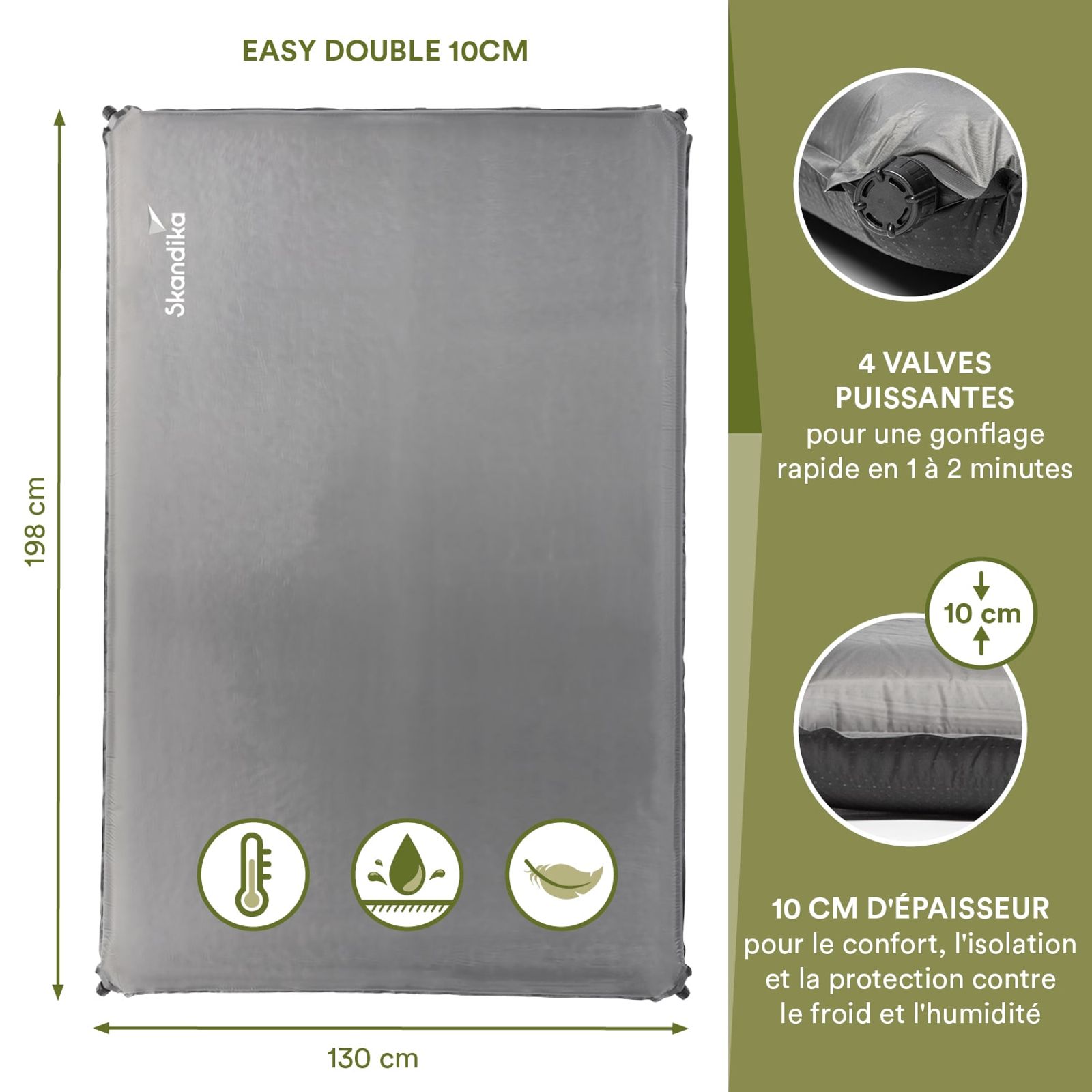 Découvrez la combinaison ultime entre confort et isolation avec notre matelas isolant double Easy ! Que ce soit pour camper à la belle étoile ou simplement faire une sieste dans le jardin, ce matelas isolant autogonflant est le compagnon idéal. Si vous ne voulez pas renoncer à un couchage confortable en camping, notre matelas isolant double Skandika Easy est fait pour vous !