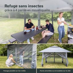 - Surface intérieure : 300 × 300 cm / Surface protégée : 396 × 396 cm / Hauteur totale : 284 / 274 / 264 cm