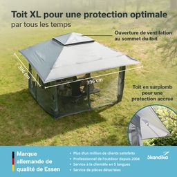 La hauteur du pavillon est réglable et verrouillable sur trois niveaux à l'aide de leviers de sécurité qui empêchent de se coincer les doigts. Même pour les personnes de grande taille, le passage sous les côtés est agréablement haut. L'avancée de toit de ce modèle apporte le petit plus en matière d'ombre et de protection contre la pluie et augmente la surface protégée à un total de 396 × 396 cm.