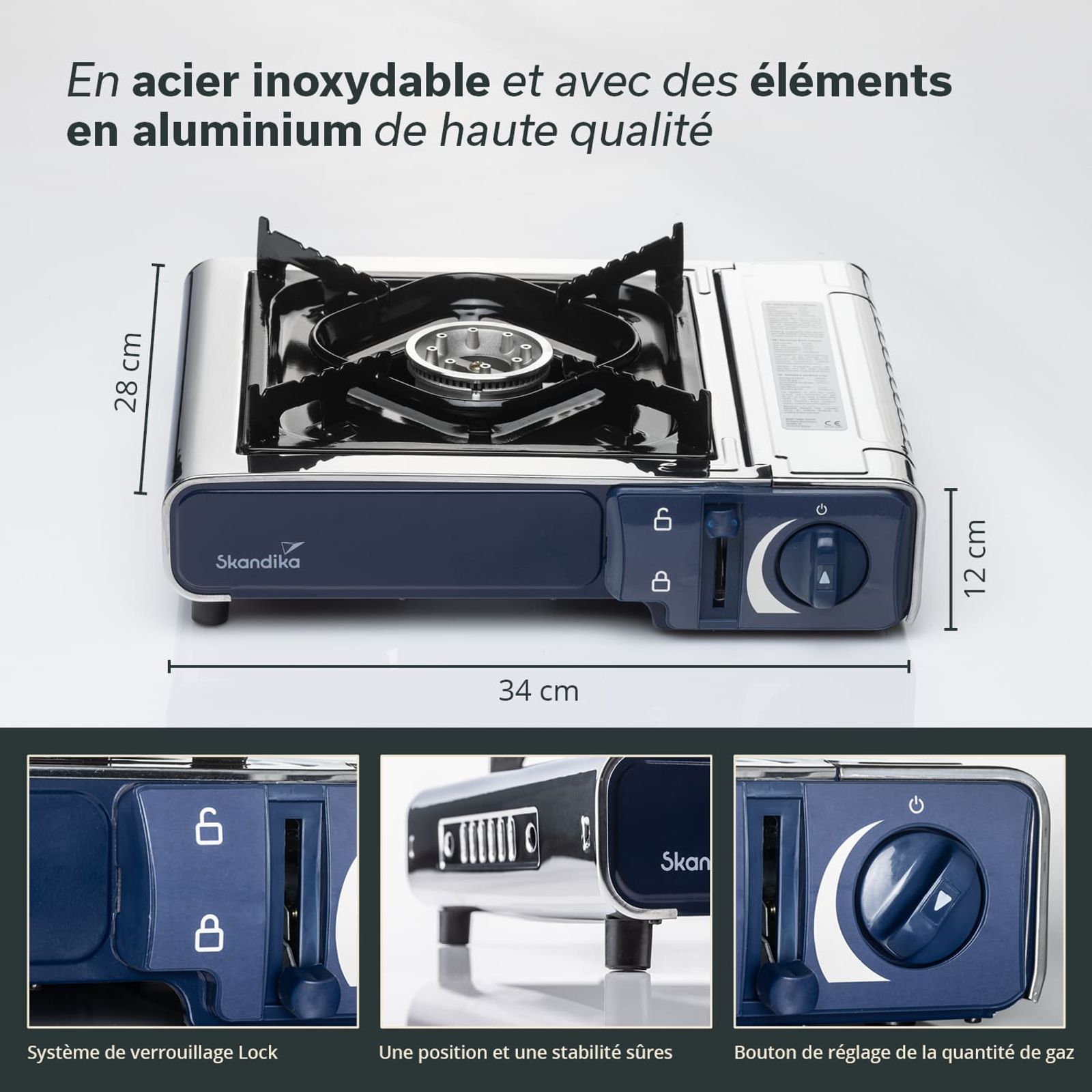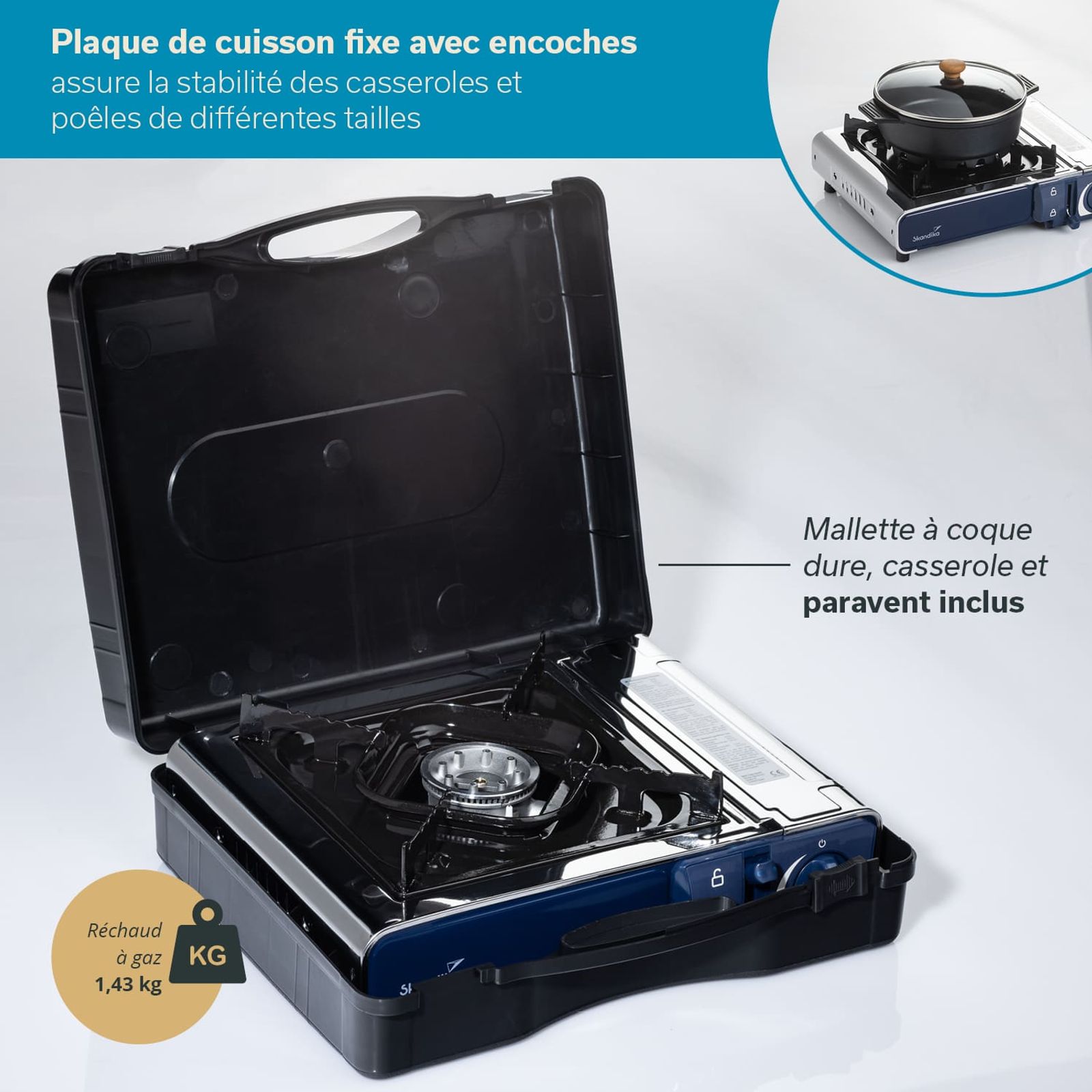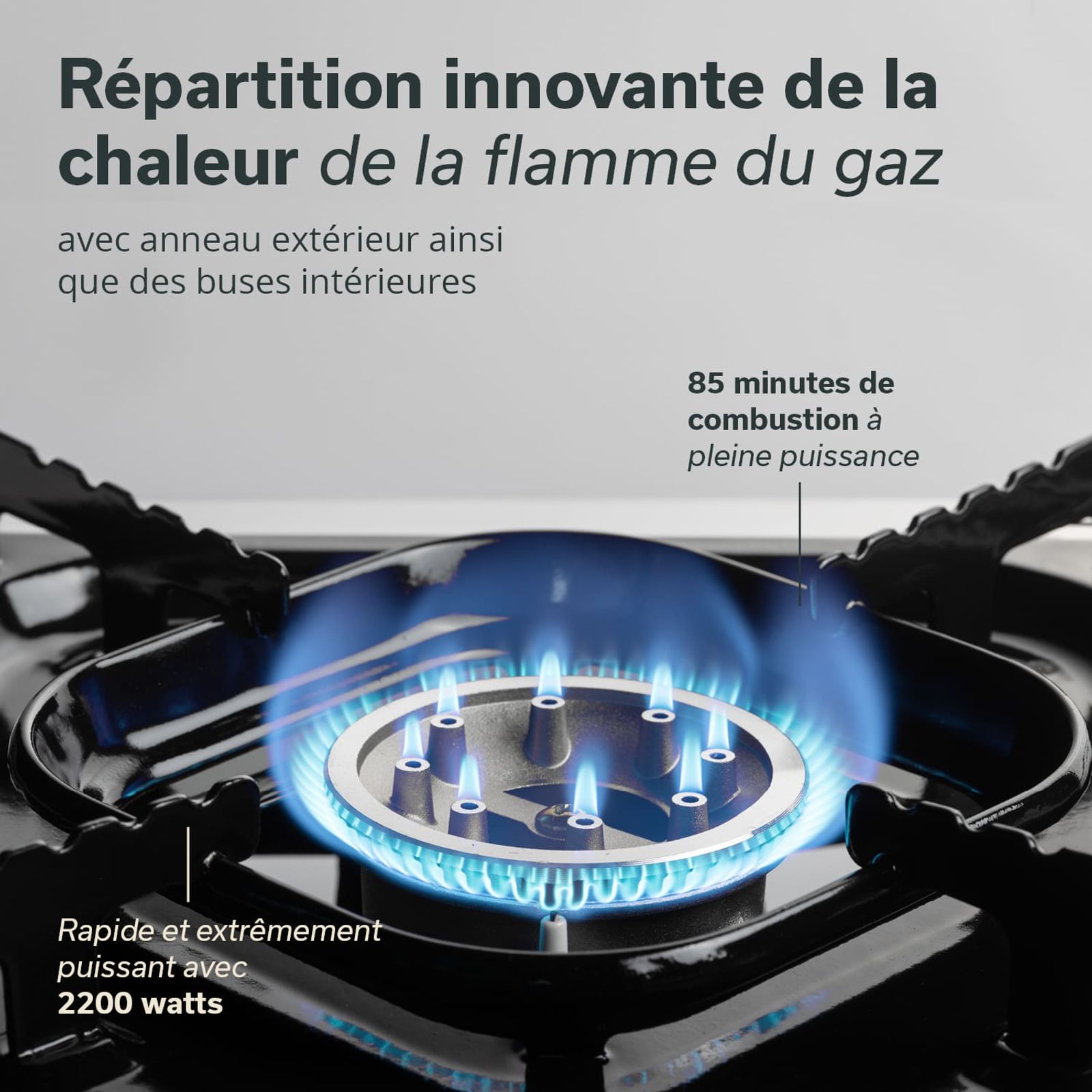 Le réchaud est doté de pieds fixes qui assurent la stabilité et la sécurité lors de la préparation des repas. Le support de casserole fixe du réchaud est doté d'encoches pour que les casseroles et poêles de différentes tailles ne glissent pas et restent toujours bien stables sur le réchaud.