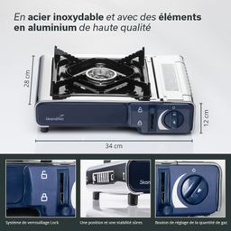 - Dimensions (réchaud) : 34 × 12 × 28 cm / Dimensions de rangement : 37,5 × 13 × 33 cm / Poids : 1,43 kg