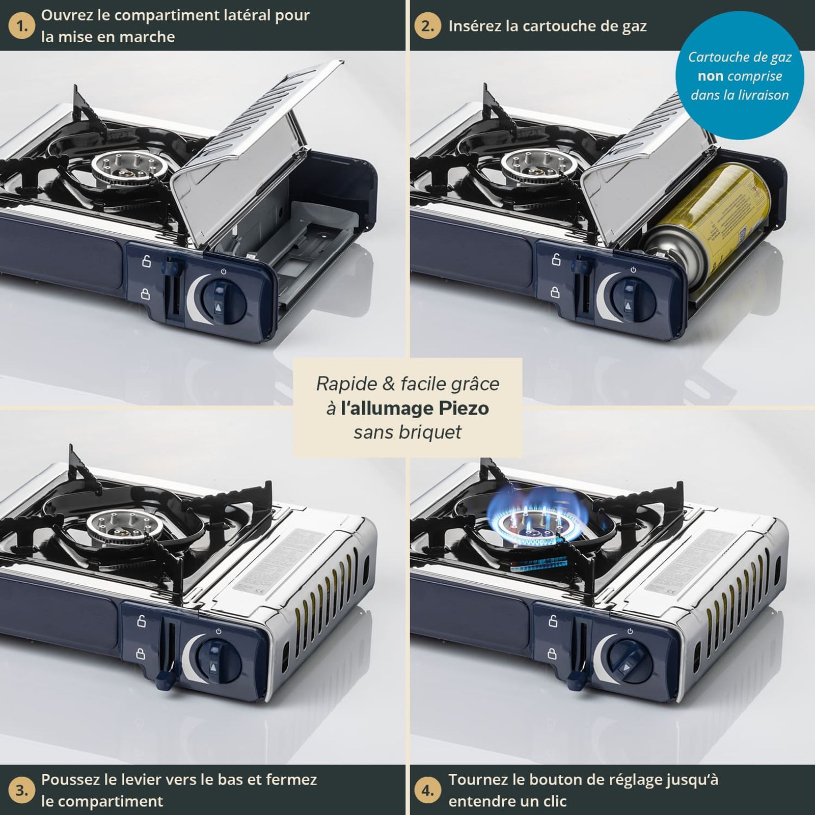 - Utilisation sûre grâce à l'allumeur piézoélectrique automatique