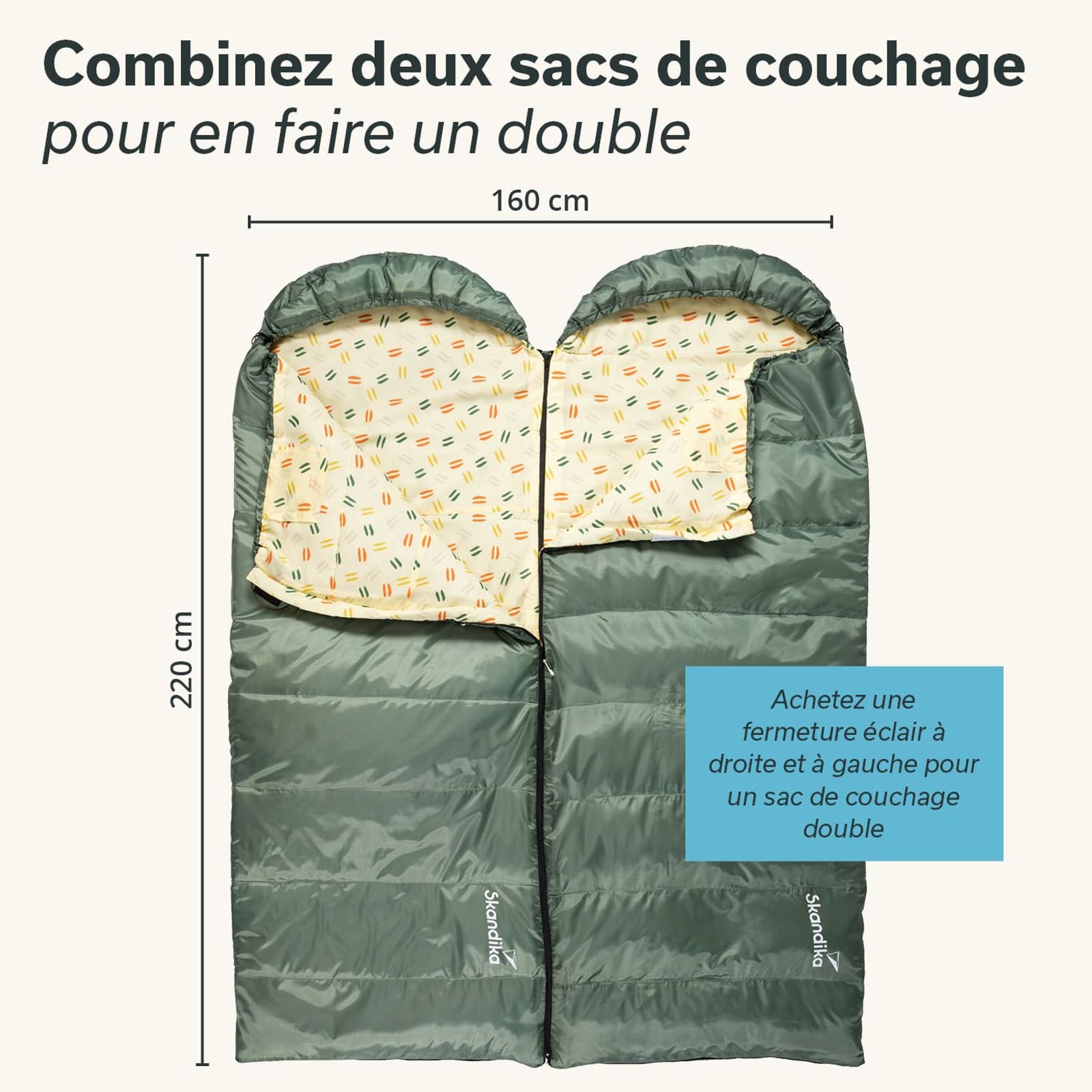 - Sac de couchage jumelable avec un sac avec fermeture éclair à gauche