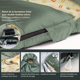 La construction robuste du sac de couchage permet un nettoyage minutieux à 30 °C sur un cycle de lavage délicat. Le garnissage reste en place et les couleurs conservent leur éclat.