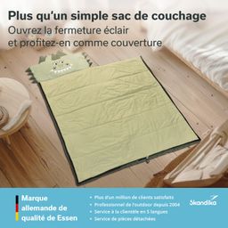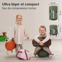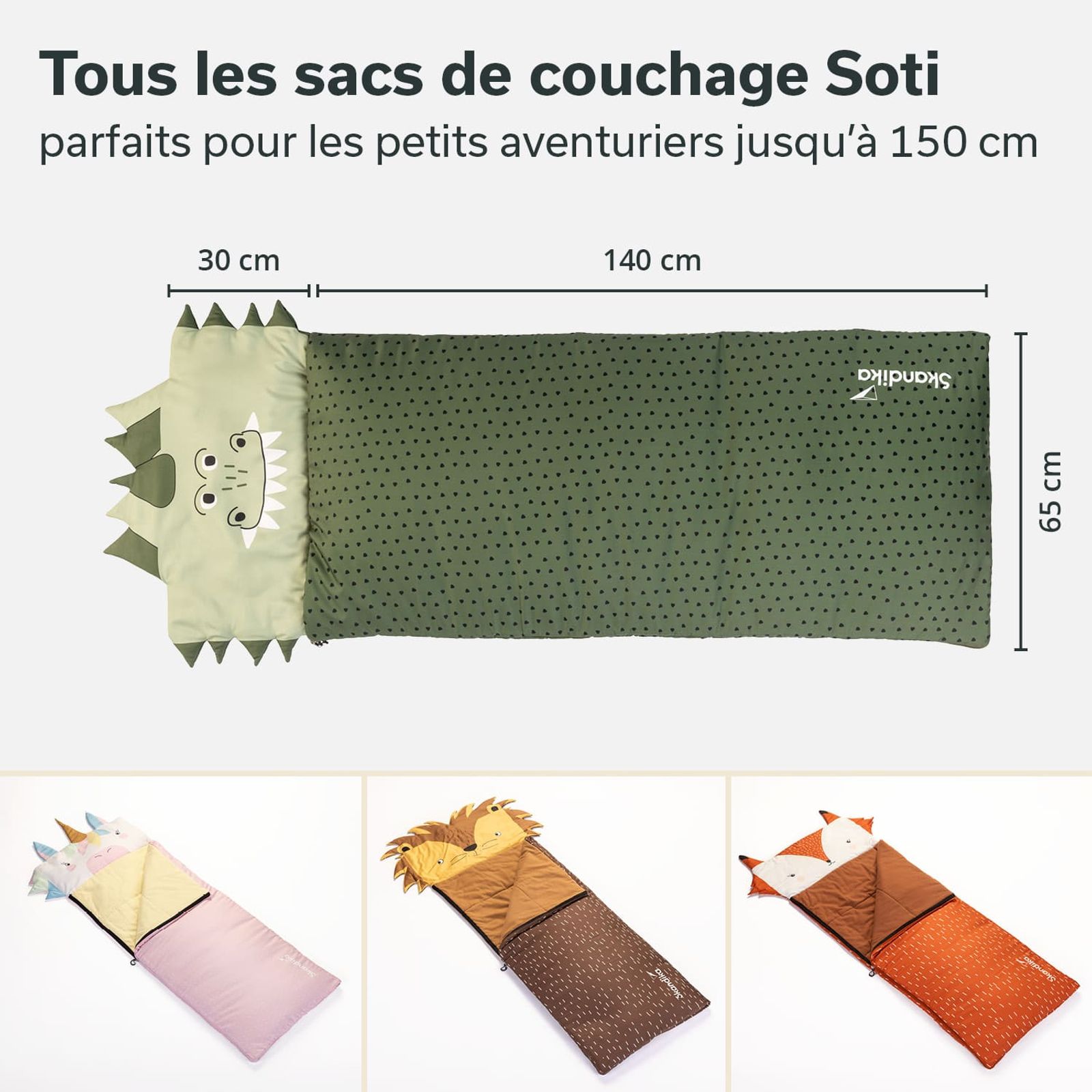 Dormir à l'extérieur, c'est amusant ! Que ce soit pendant les vacances chez papy et mamie, lors d'une soirée pyjama chez des amis de la maternelle ou en tant que professionnel de l'outdoor avec les parents au camping. Les sacs de couchage colorés attirent particulièrement l'attention avec leur grande tête à l'effigie d'un animal mignon. Finis les designs monochromes et ennuyeux. Avec les Sotis de Skandika, le lion, le dinosaure, la licorne et le renard aident à chasser la peur du noir et procurent beaucoup de plaisir. Soti - le compagnon animalier des petits aventuriers !