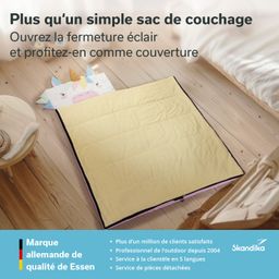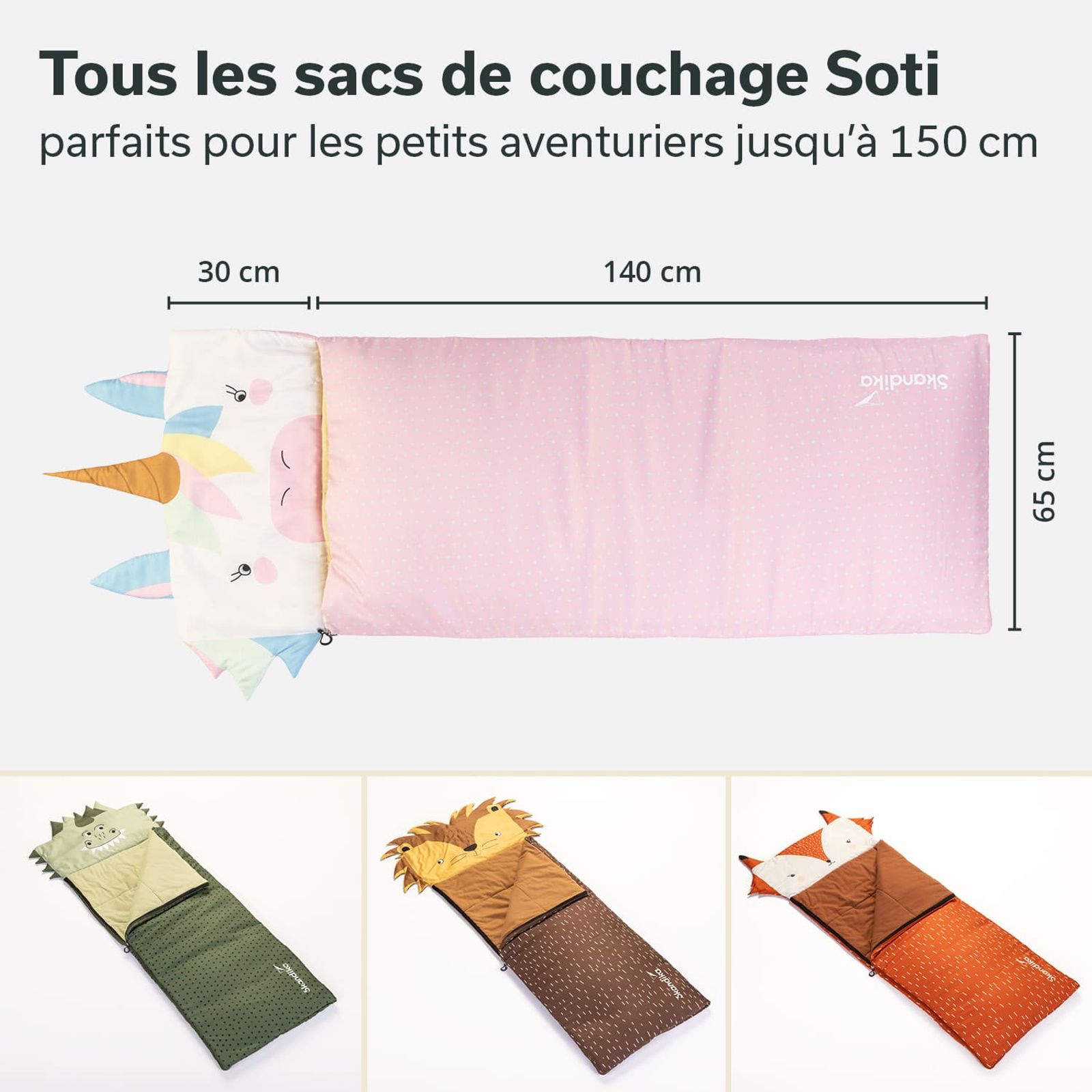 Dormir à l'extérieur, c'est amusant ! Que ce soit pendant les vacances chez papy et mamie, lors d'une soirée pyjama chez des amis de la maternelle ou en tant que professionnel de l'outdoor avec les parents au camping. Les sacs de couchage colorés attirent particulièrement l'attention avec leur grande tête à l'effigie d'un animal mignon. Finis les designs monochromes et ennuyeux. Avec les Sotis de Skandika, le lion, le dinosaure, la licorne et le renard aident à chasser la peur du noir et procurent beaucoup de plaisir. Soti - le compagnon animalier des petits aventuriers !
