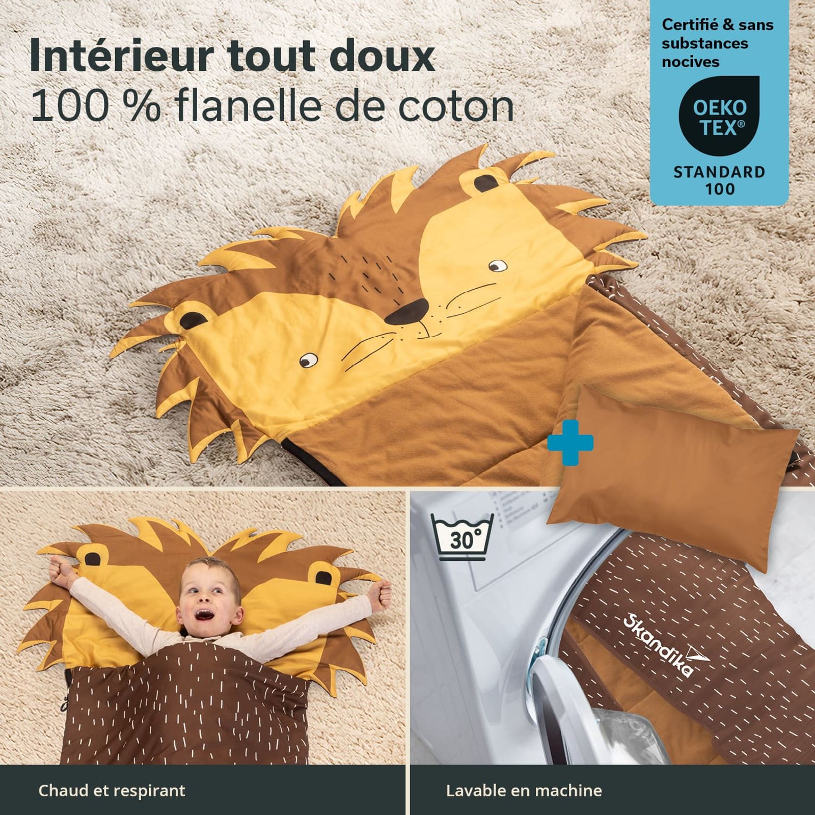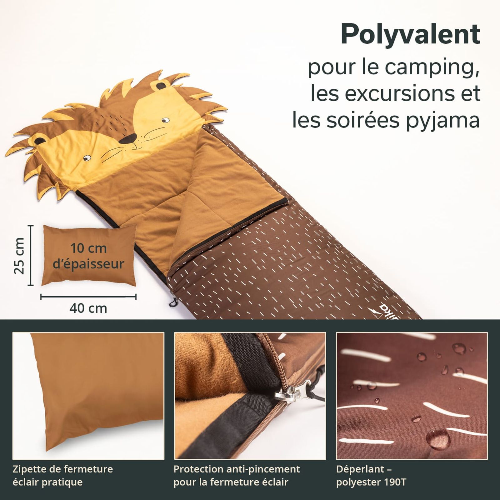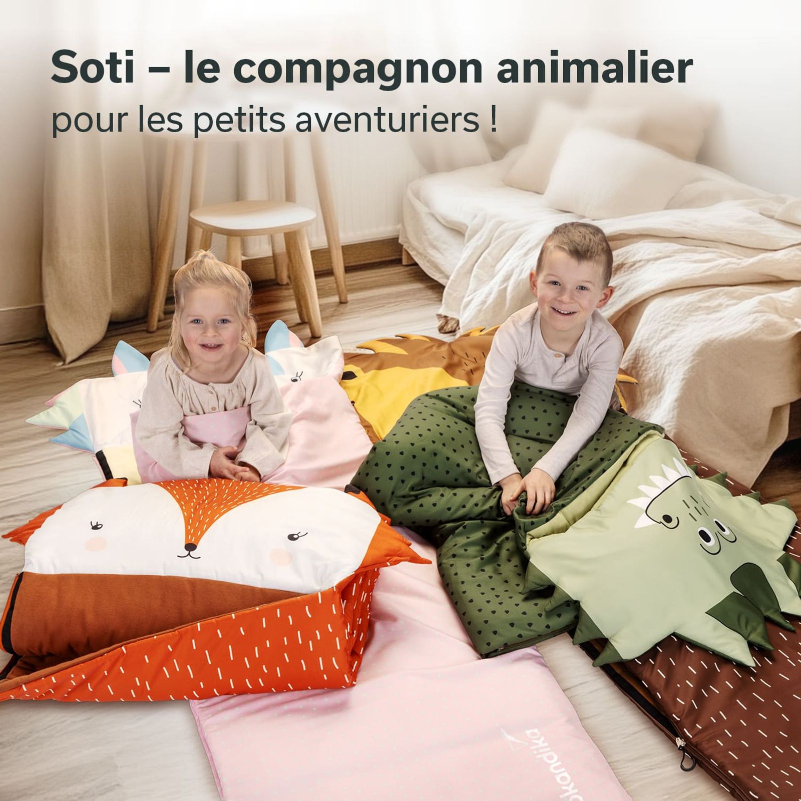 Dormir à l'extérieur, c'est amusant ! Que ce soit pendant les vacances chez papy et mamie, lors d'une soirée pyjama chez des amis de la maternelle ou en tant que professionnel de l'outdoor avec les parents au camping. Les sacs de couchage colorés attirent particulièrement l'attention avec leur grande tête à l'effigie d'un animal mignon. Finis les designs monochromes et ennuyeux. Avec les Sotis de Skandika, le lion, le dinosaure, la licorne et le renard aident à chasser la peur du noir et procurent beaucoup de plaisir. Soti - le compagnon animalier des petits aventuriers !