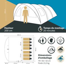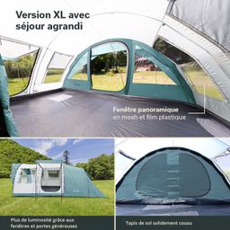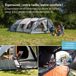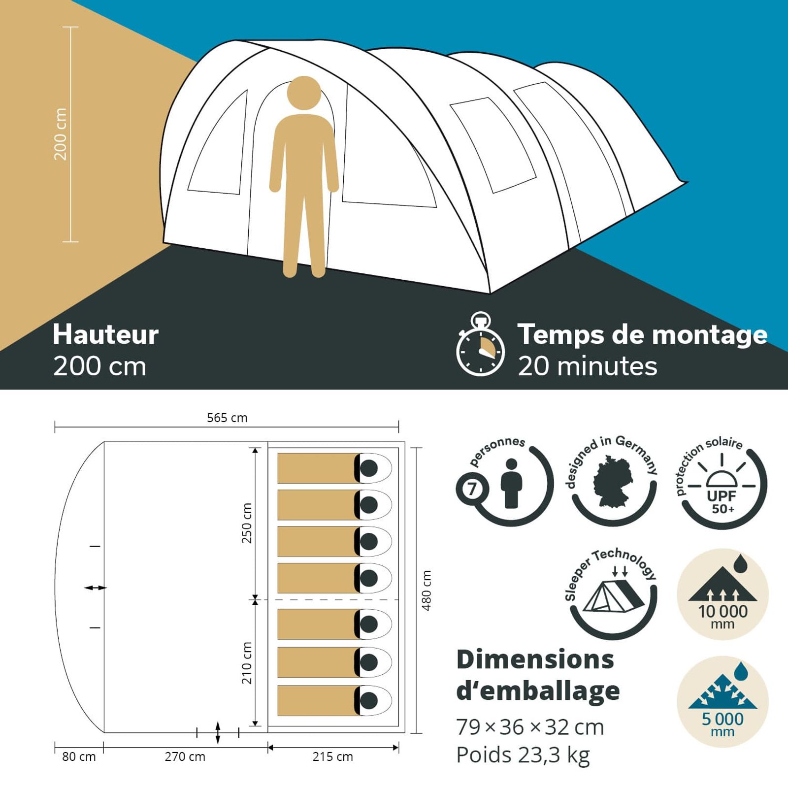 Tente tunnel spacieuse pour 7 personnes avec un grand séjour encore plus grand pour un peu plus de confort. Montée en un clin d'œil et avec une hauteur confortable de 200 cm, la tente permet de vivre de superbes aventures en plein air pour les familles avec enfants ou les groupes d'amis.