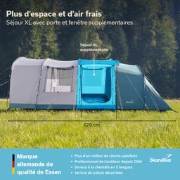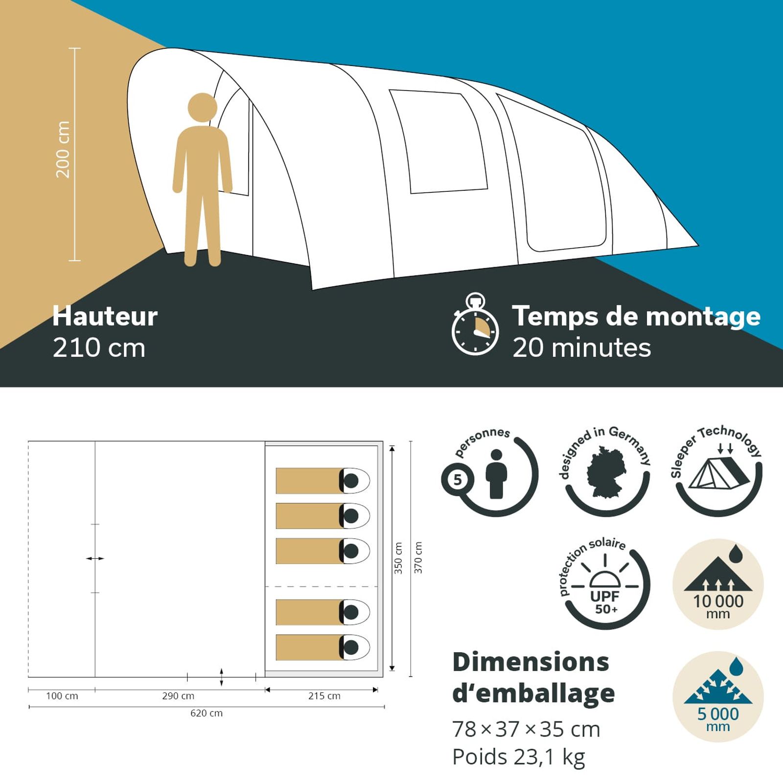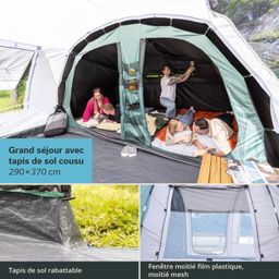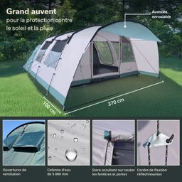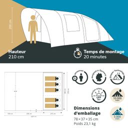 Tente tunnel spacieuse pour 5 personnes avec un séjour encore plus grand pour un petit plus de confort. Montée en un clin d'œil et avec une hauteur confortable de 200 cm, la tente permet de vivre de superbes aventures en plein air pour les familles avec enfants ou les groupes d'amis.