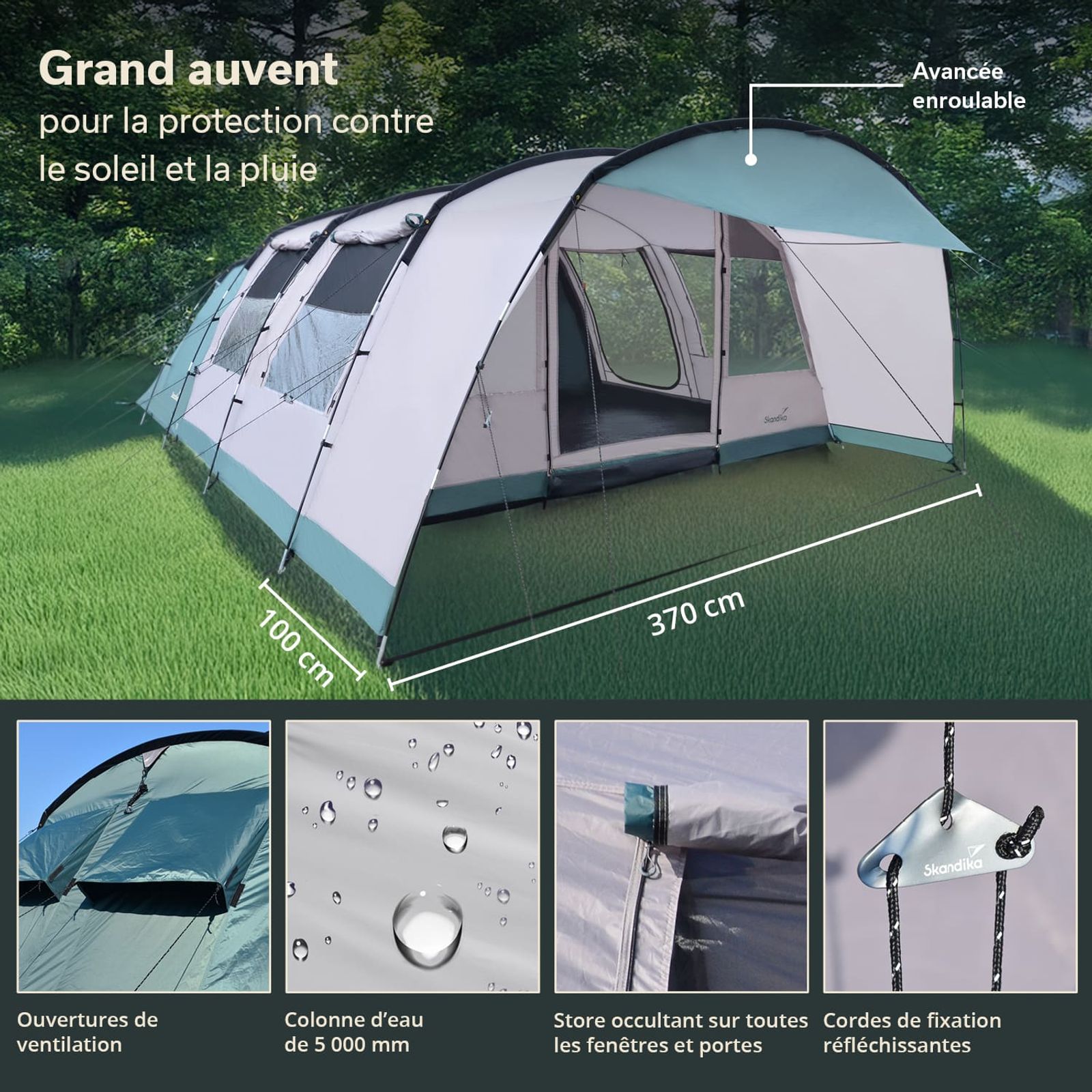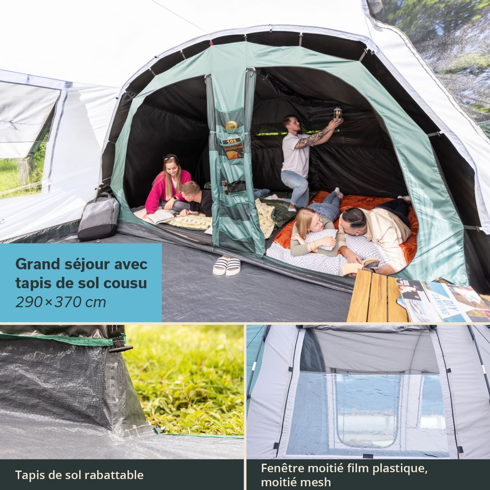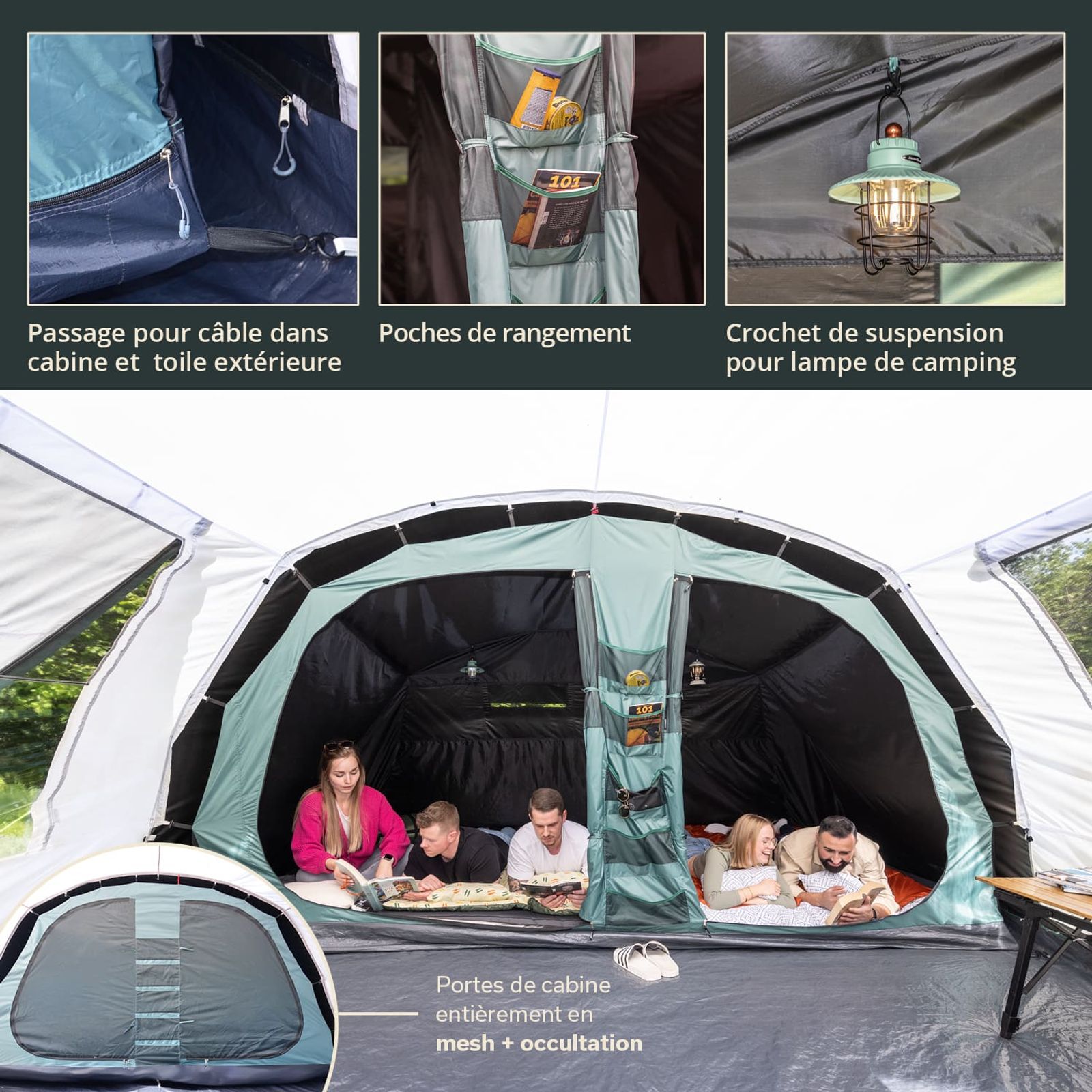 - Avec poches de rangement, passage pour câbles protégé, crochet pour lampes de camping, sac de transport