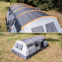 La tente familiale offre de nombreux extras pratiques comme des poches de rangement, un crochet de suspension au plafond pour une lampe de camping et un passage pour les câbles. De grandes fenêtres en film plastique et les deux entrées opposées avec un petit auvent assurent beaucoup de lumière à l'intérieur de la tente.