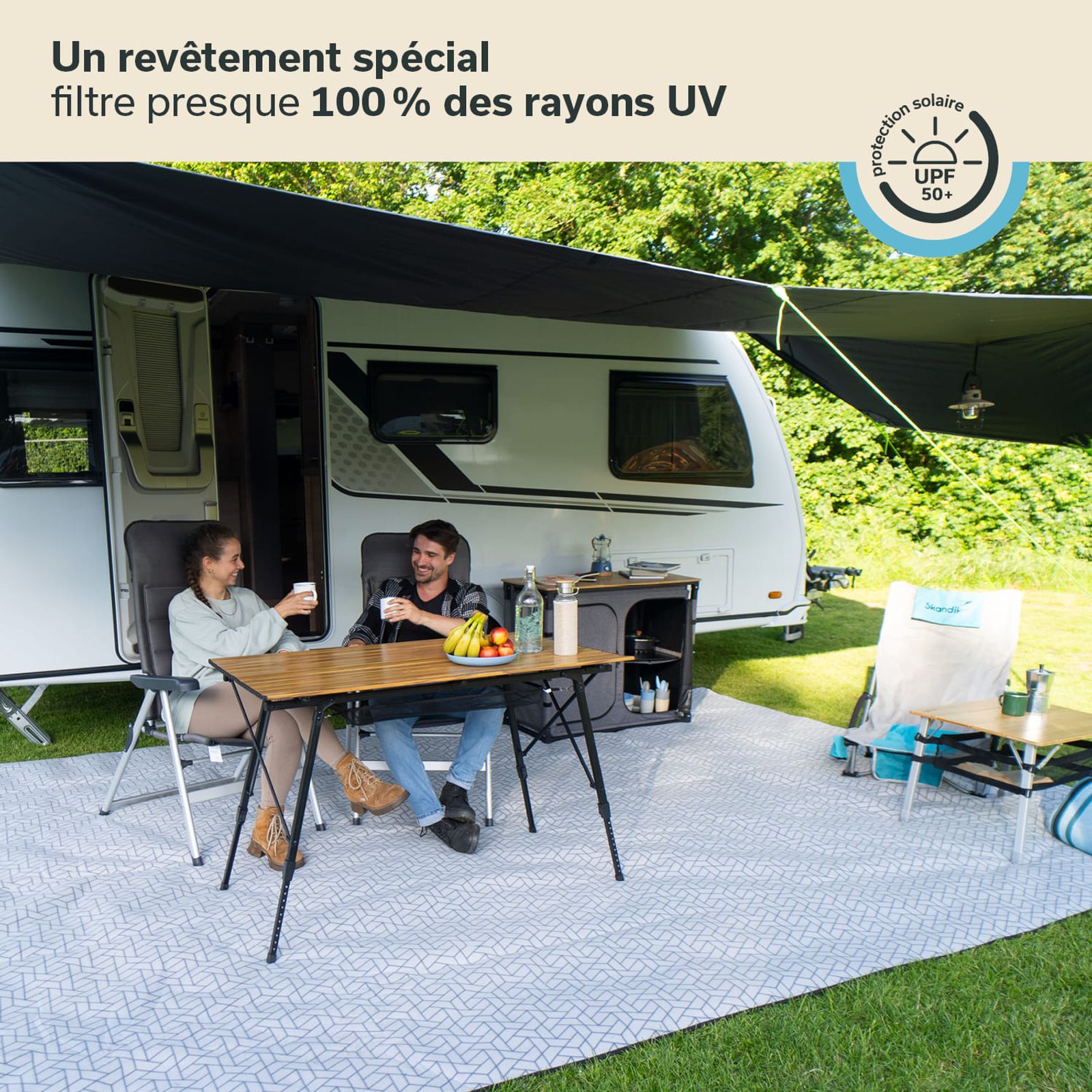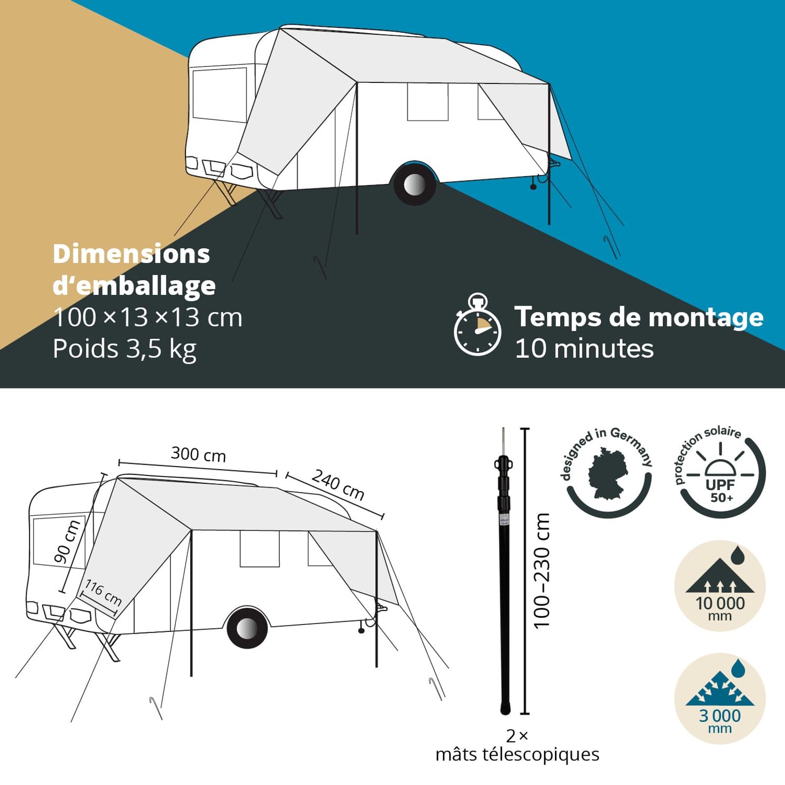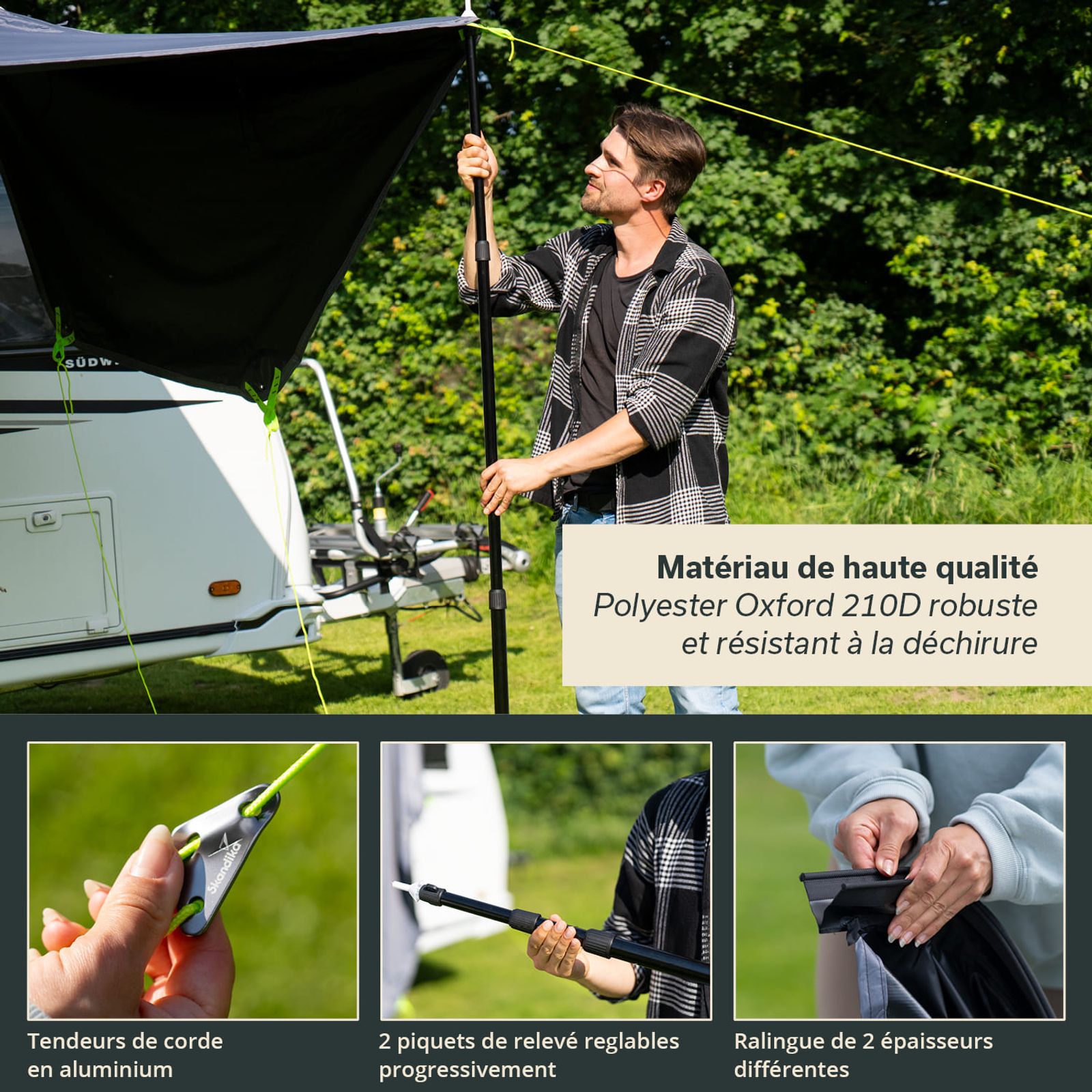 Le voile d'ombrage Skandika Freeway est la solution idéale pour les amateurs de camping qui souhaitent ajouter un espace extérieur protégé à leur caravane. Elle offre une protection fiable contre les intempéries et crée un espace supplémentaire pour passer des heures de détente en plein air. Grâce à son montage facile et à ses possibilités d'utilisation flexibles, c'est un accessoire indispensable pour chaque séjour en camping.- Pour une entrée de caravane à l'abri des intempéries