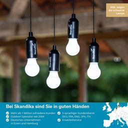 Die handliche kleine LED-Lampe im Glühbirnen-Look wird einfach mit drei AAA Batterien betrieben und ist komplett unabhängig von einer festen Stromquelle. Aufgehängt wird die Lampe mittels 100 cm langer Kordel am oberen Ende, die sich auf verschiedensten Arten befestigen lässt. Direkt an einer Leine festgeknotet, zur Schlaufe gebunden und an einem Haken aufgehängt oder einfach ein paar Mal um einen Ast gewickelt – die lange Kordel ermöglicht den unkomplizierten Einsatz dieses kleinen Leuchtwunders immer und überall.