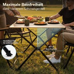 Für einen wackelfreien Stand auf jedem Untergrund sorgen die feinjustierbaren Schraubfüße, die Bodenunebenheiten zuverlässig ausgleichen. Ob auf Rasen, Schotter oder gepflasterten Flächen, der Klapptisch steht stets sicher.