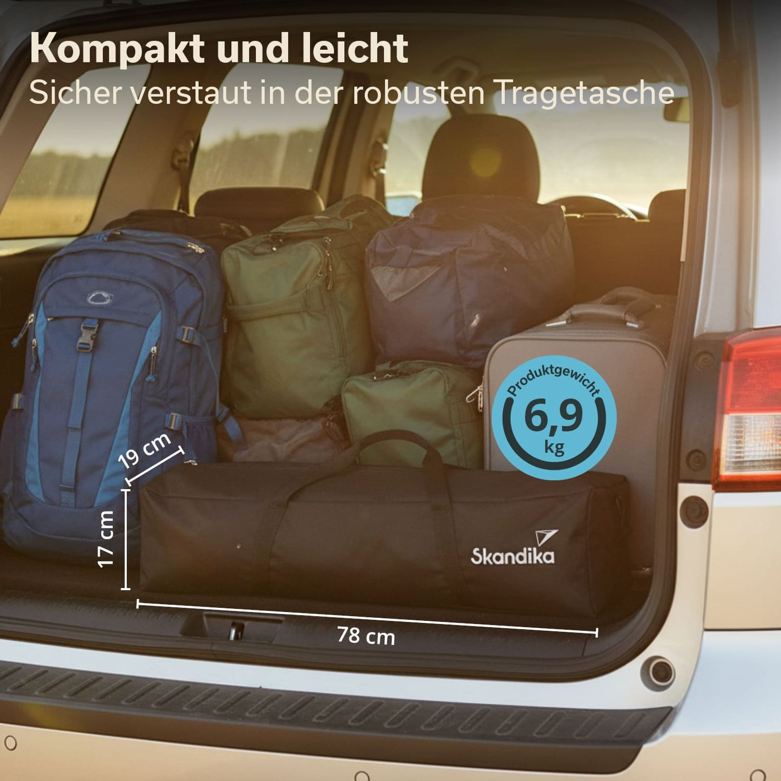 - Maße 120 × 80 × 70 cm | Faltmaß 78 × 19 × 17 cm | Packmaß 80 × 21 × 19 cm | Gewicht 6,9 kg