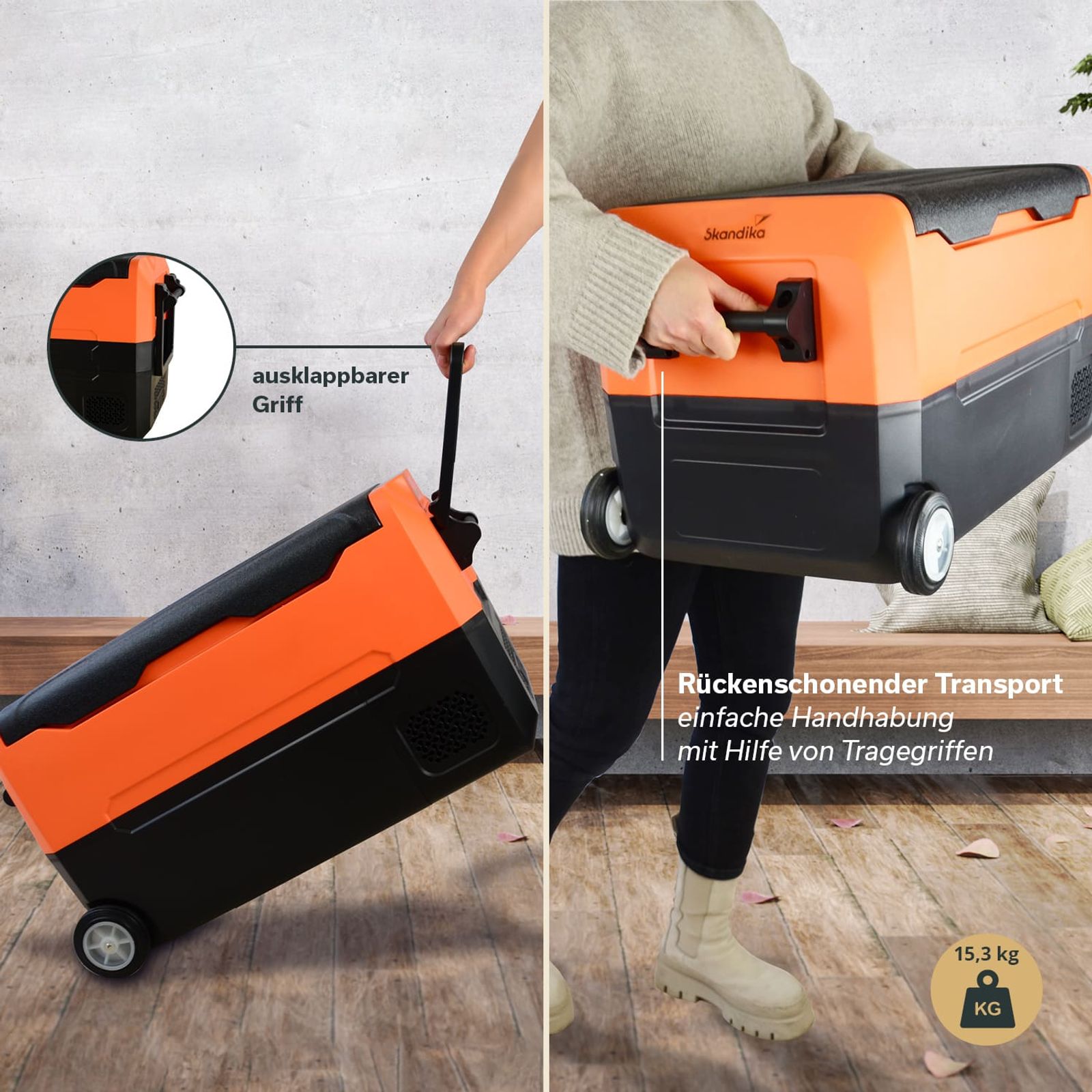 - Transportrollen und ausklappbarer Griff für leichten Transport