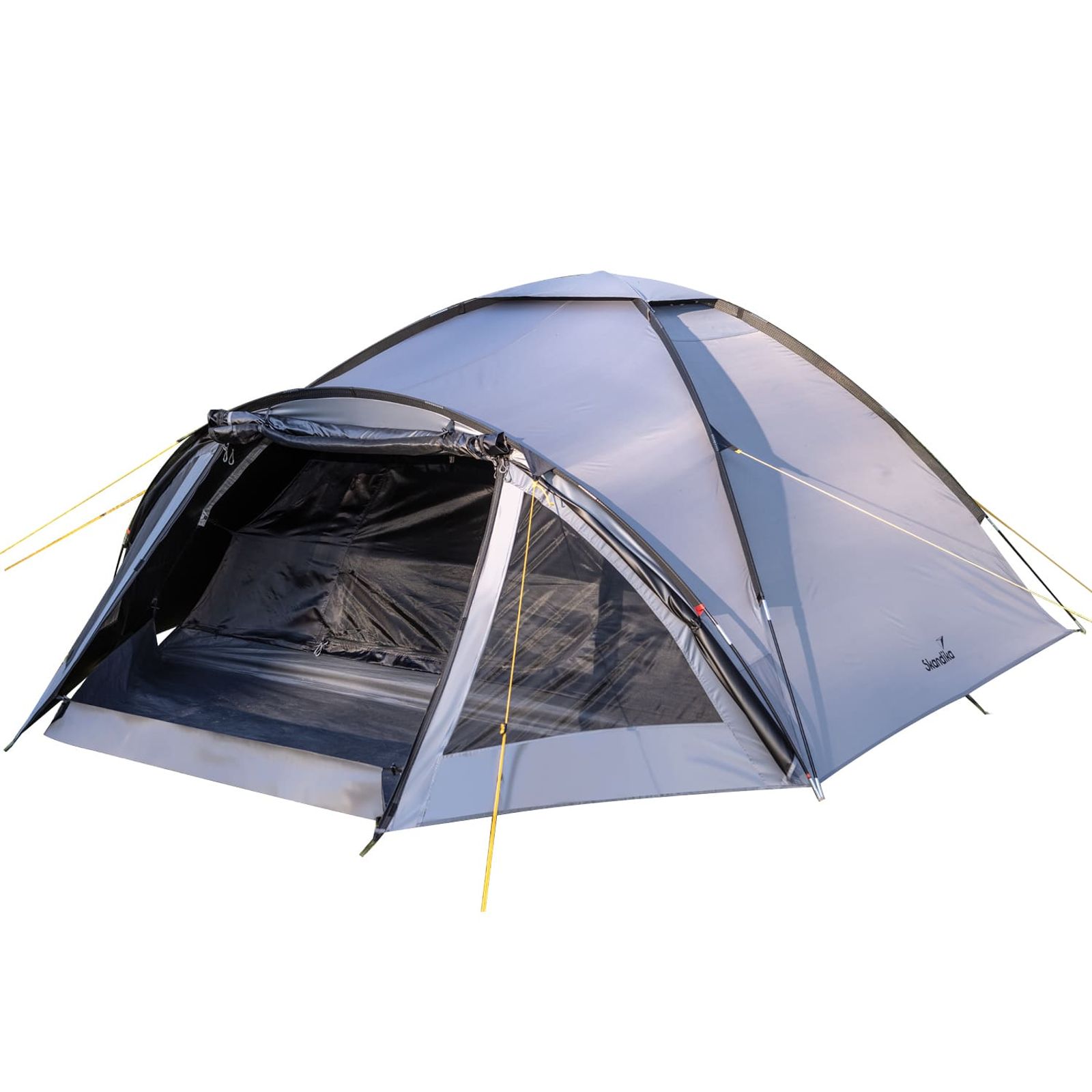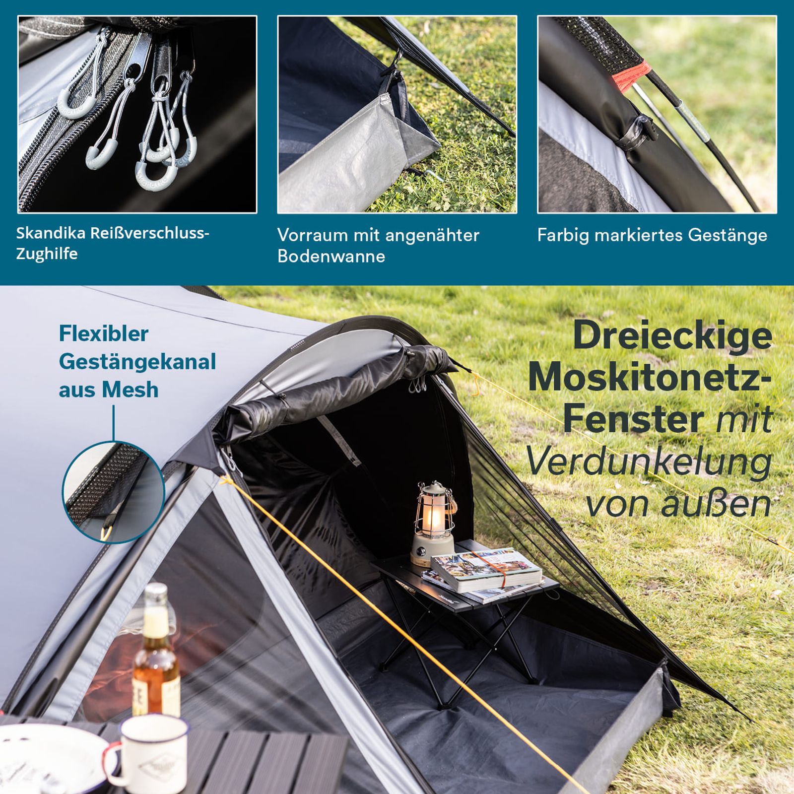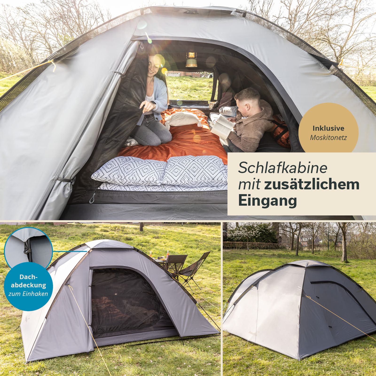 - Kompaktes Kuppelzelt mit Kabine für 3 Personen und geräumigem Vorraum für Gepäck