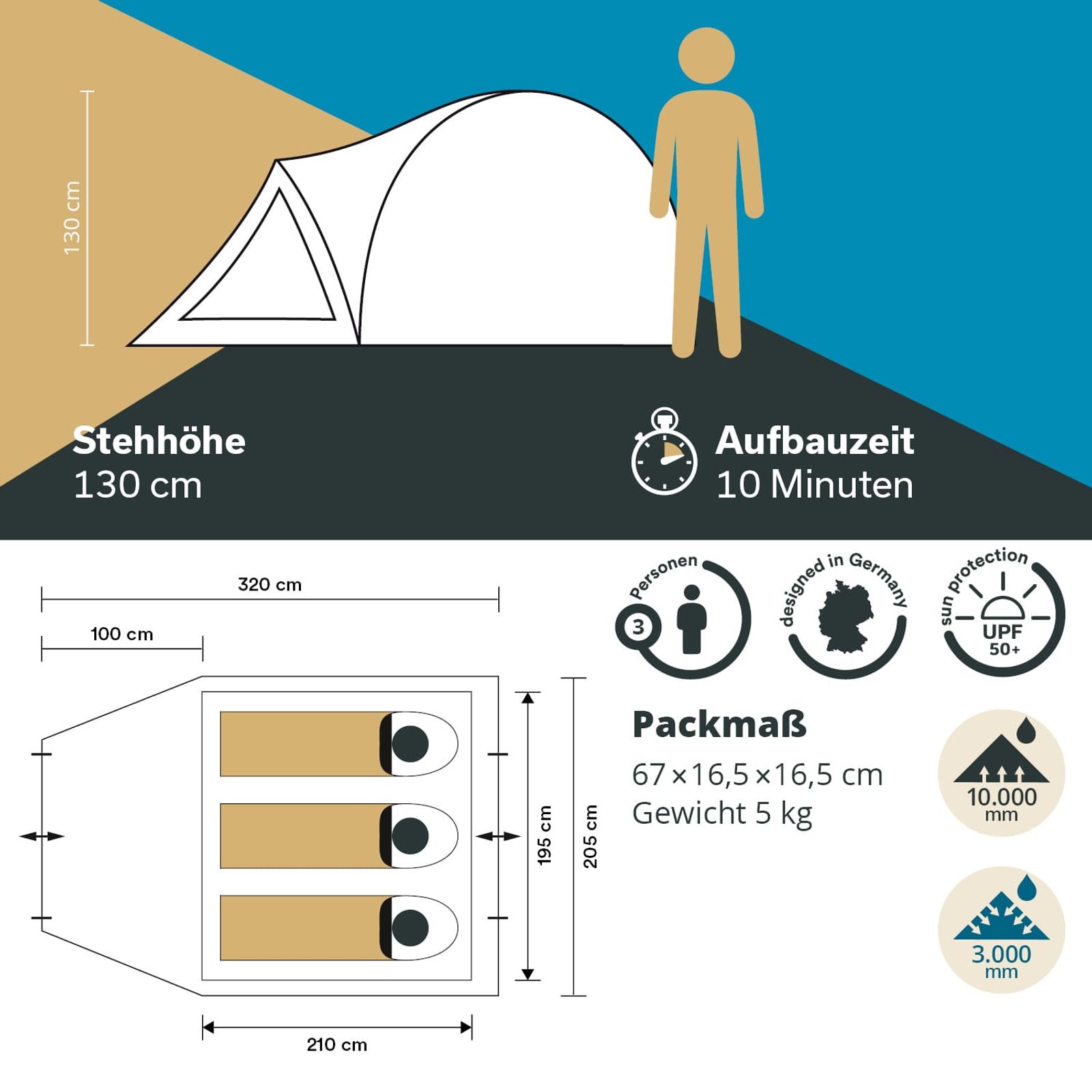 - Außenzelt 320 × 205 × 130 cm / Kabine 210 × 195 cm / Gewicht 5,5 kg / Farbe grau/schwarz