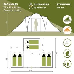 - Zelt 530 × 370 cm / Kabinen (3×) 200 × 150 cm / Packmaß 72 × 25 × 27 cm / Gewicht 12,5 kg