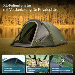 Die Dreiecks-Folienfenster lassen viel Licht ins Zelt fallen und ermöglichen eine gute Aussicht in die Natur. Bei Bedarf können sie mit Blenden verdunkelt werden. So ist stets für Privatsphäre gesorgt.