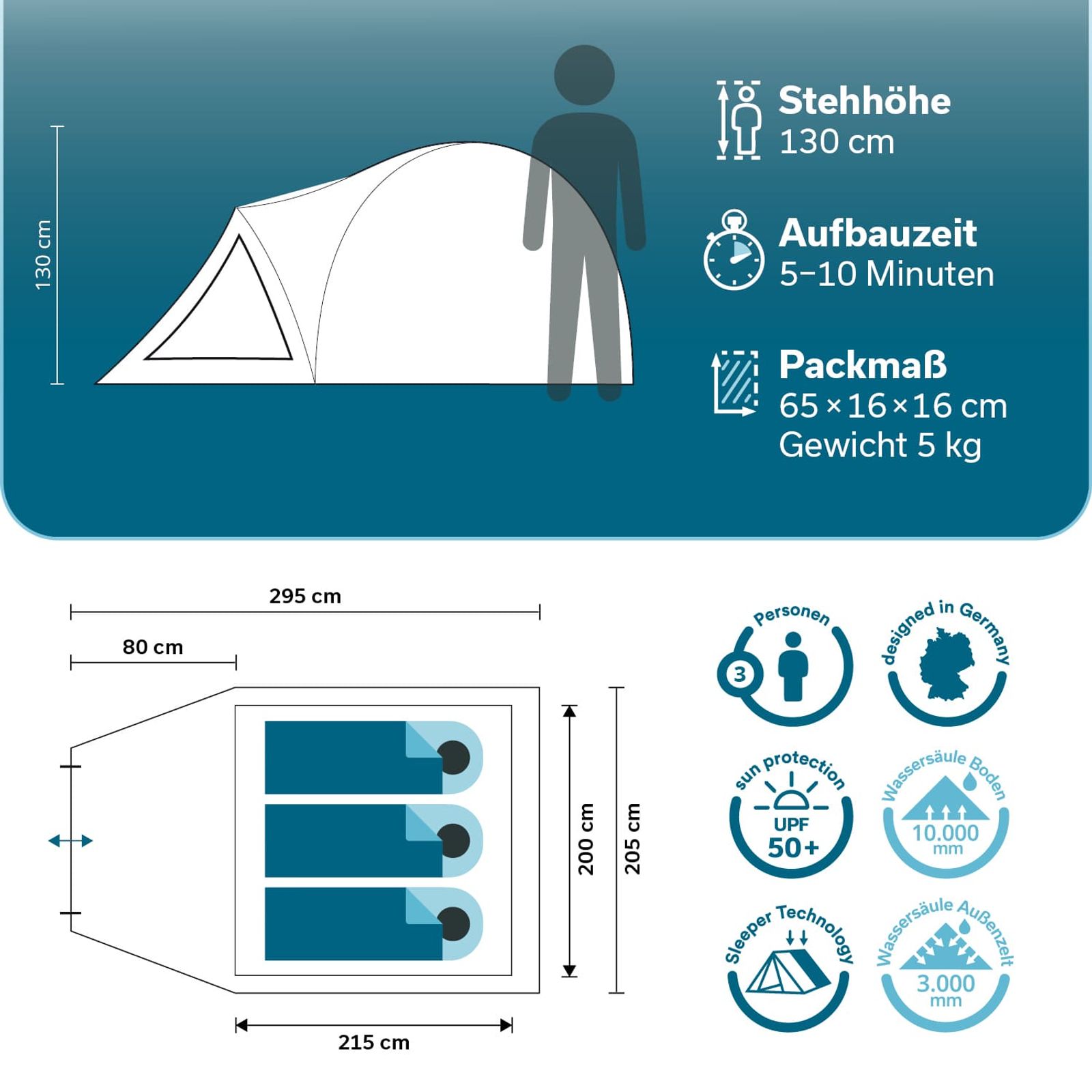 - Größe (gesamt) 295 × 205 × 130 cm / Größe (Kabine) 215 × 200 × 125 cm / Gewicht 5 kg