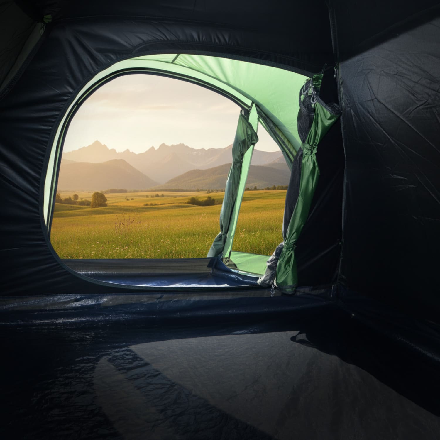 Bei diesem Zelt wurde auf dem Außenzelt im Bereich der Schlafkabine eine spezielle schwarze Beschichtung aufgetragen, die fast 100 % des Sonnenlichtes absorbiert. Perfekt zum Ausschlafen oder mittags ein Nickerchen machen.