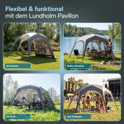 Mit einer Wassersäule von 2.000 mm, versiegelten Nähten und Regenschürzen an den Seitenwänden ist der Lundholm wetterfest und hält auch einem kurzen Regenschauer stand, sodass das Innere des Pavillons vor Sonne, Wind und Regen geschützt ist.