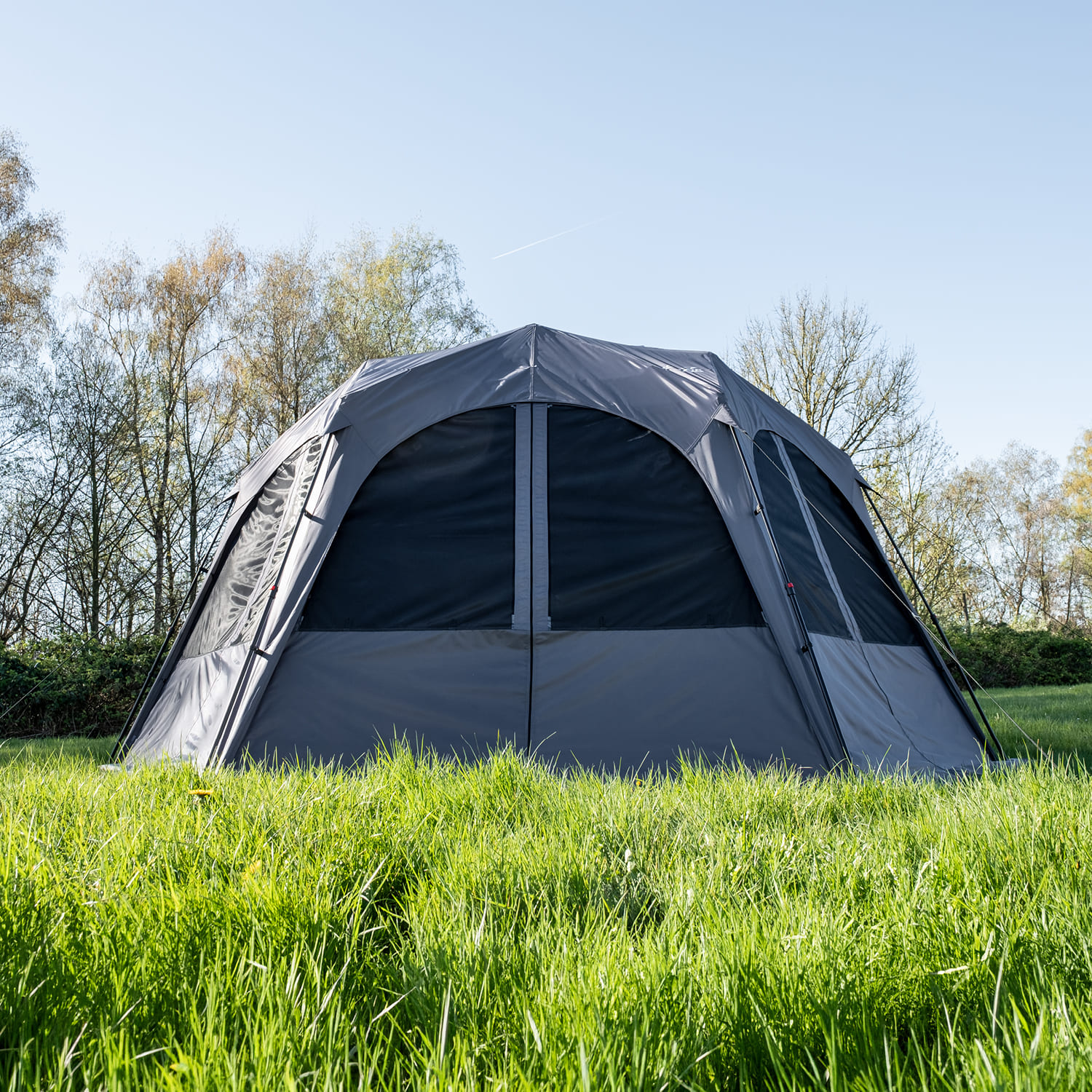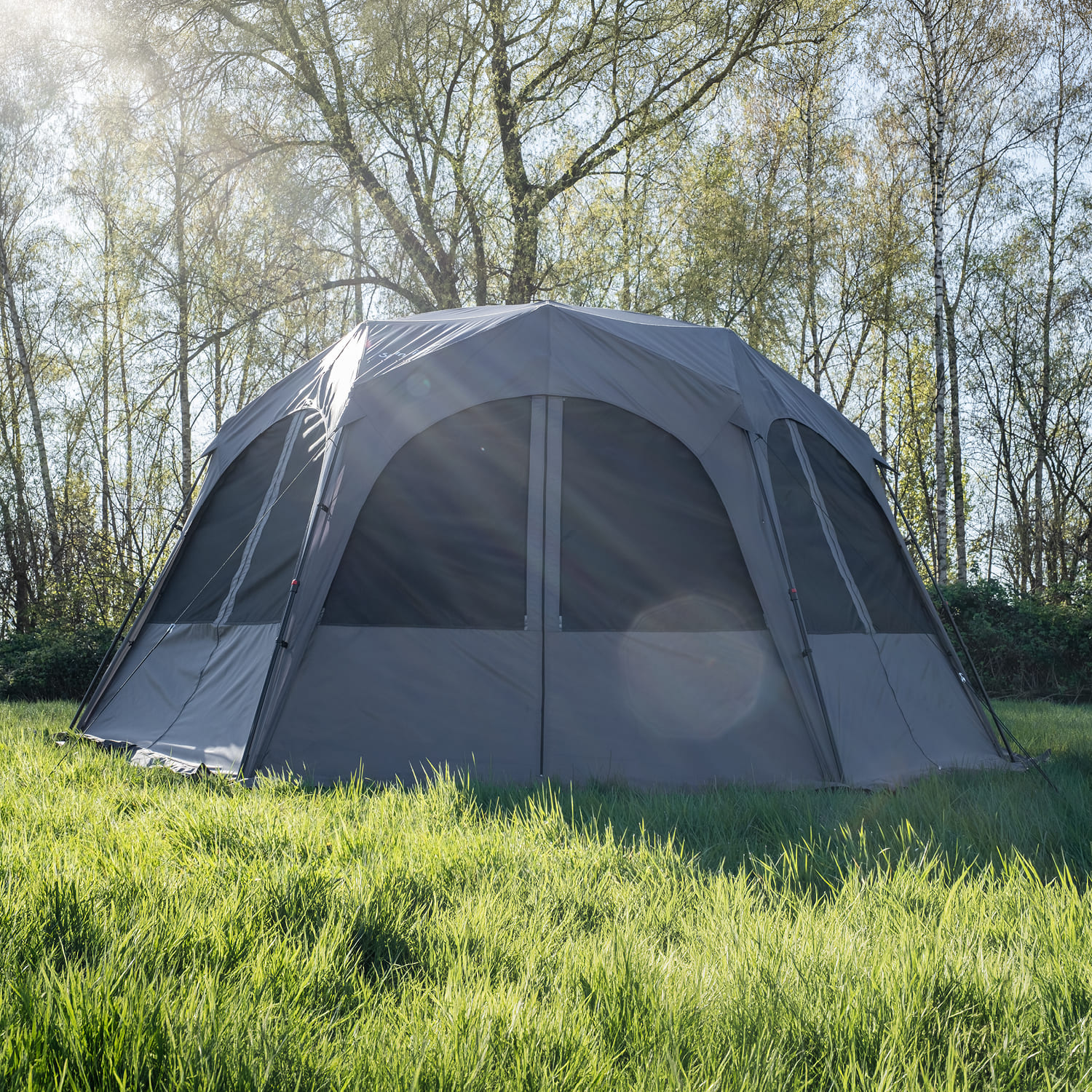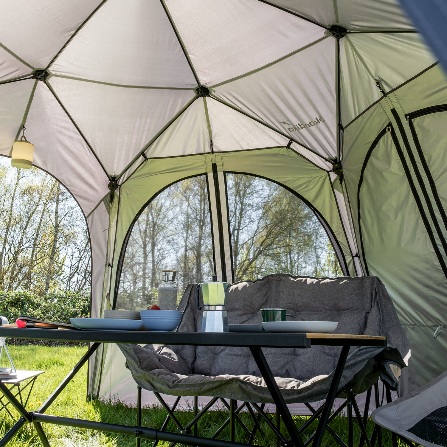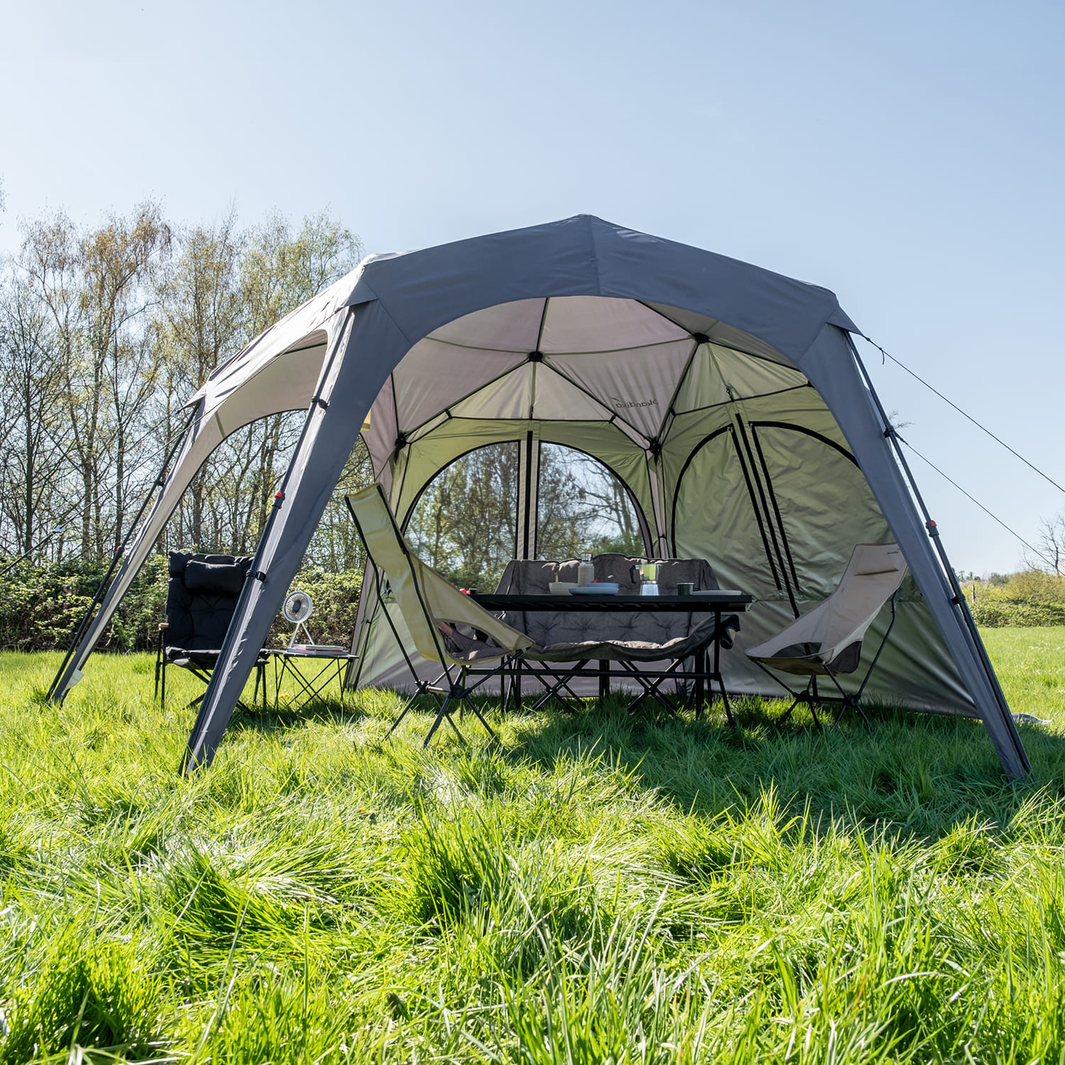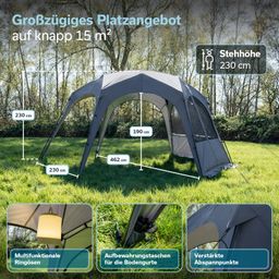 Die sechseckige Form mit einer Grundfläche von 462 × 400 cm bietet großzügigen Platz für Familie, Freunde oder Ausrüstung. Durch die mittige Höhe von 230 cm entsteht ein luftiger Innenraum, in dem sich alle bequem bewegen können.