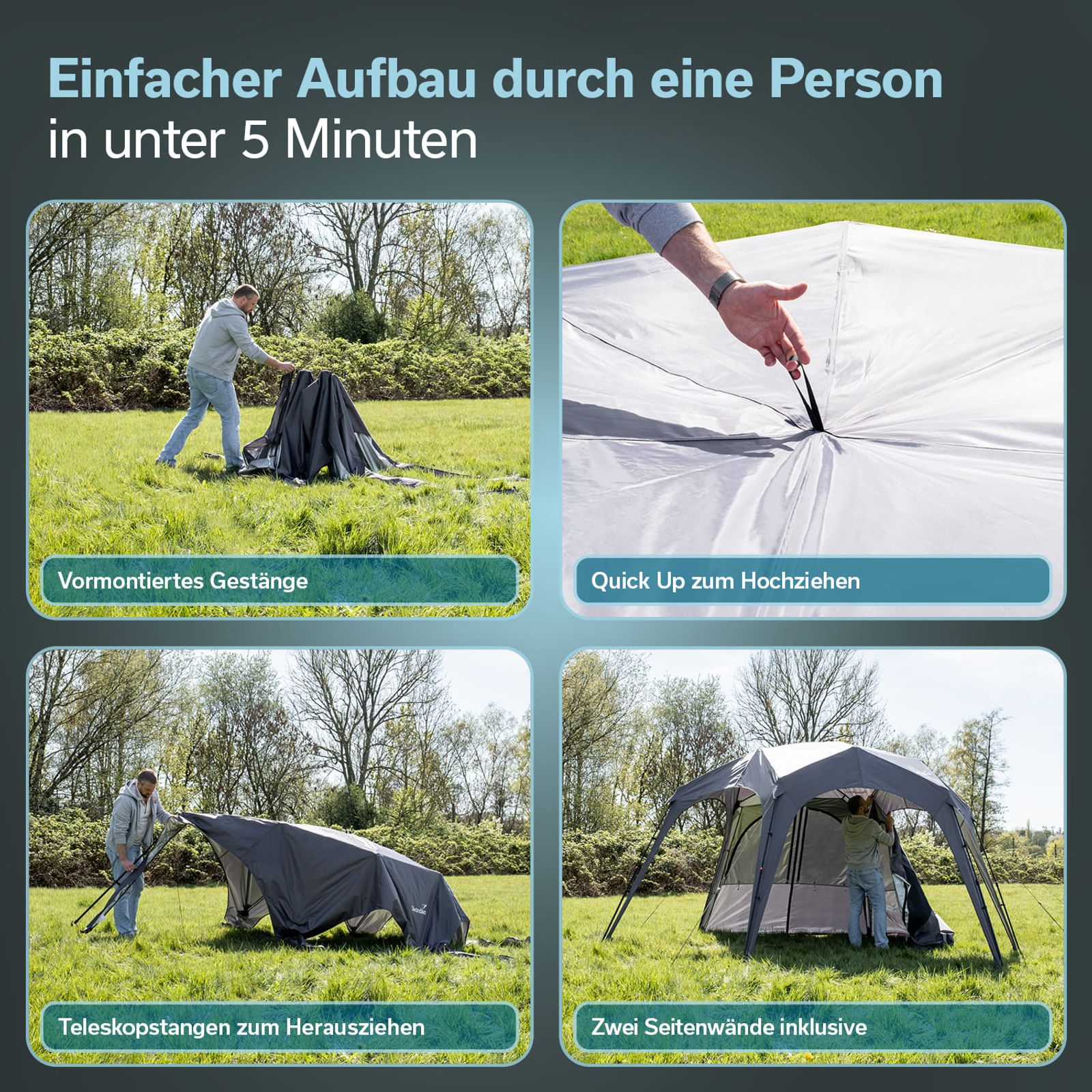 - Besonders schneller Aufbau dank vormontiertem Gestänge