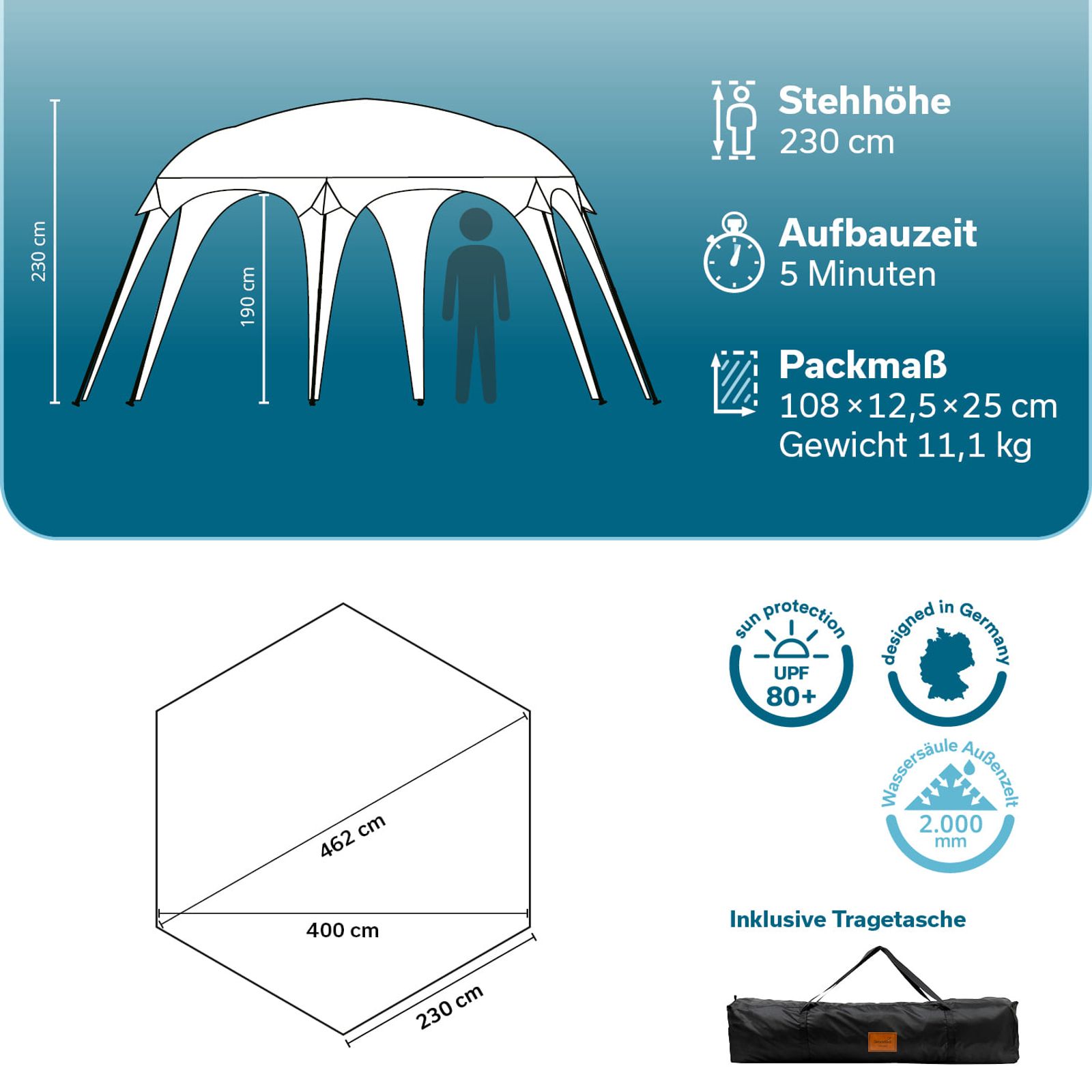 - Fläche 462 × 400 cm / Höhe 230 cm / Durchlaufhöhe 180 cm / Packmaß 108 × 12,5 × 25 cm / Gewicht 11,1 kg