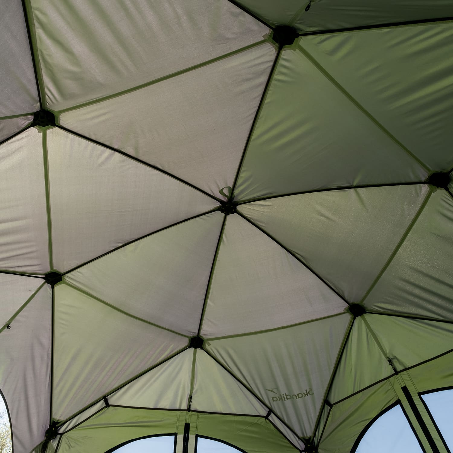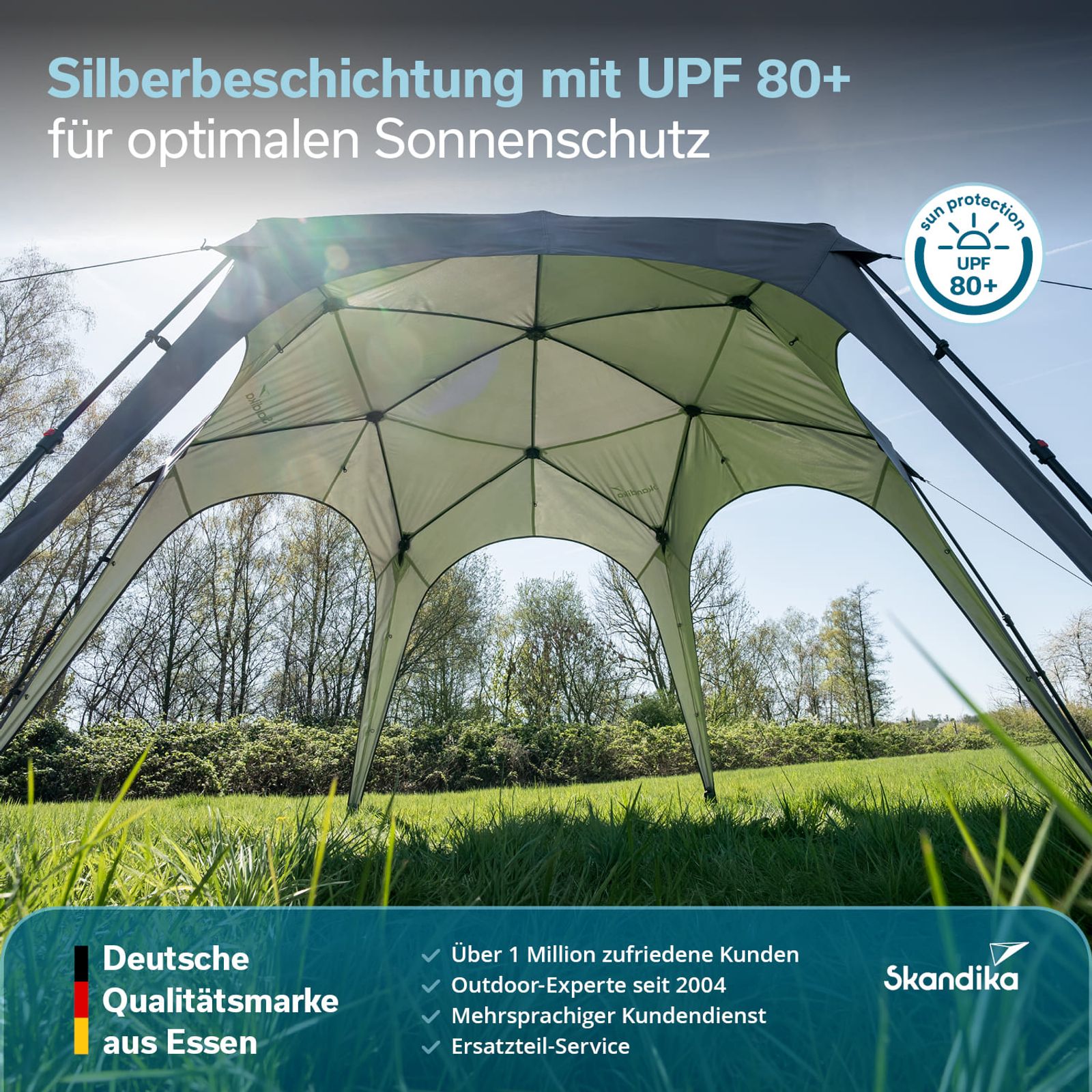 Das Zeltmaterial ist innen silberbeschichtet und verfügt über einen UV-Schutzfaktor von 80+. Diese besondere Behandlung des Stoffes bewahrt das Material davor, spröde oder rissig zu werden, und trägt maßgeblich zur Langlebigkeit des Pavillons bei.